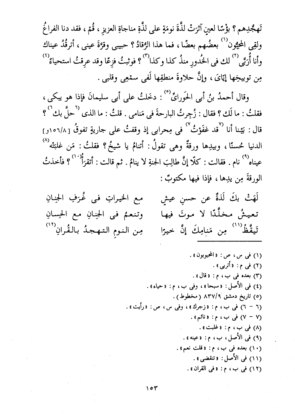 تَهَجُّدِهِمْ؟ بُؤْسًا لَعِينٍ آثَرَتْ لَذَّةَ نَوْمَةٍ عَلَى لَذَّةِ مُنَاجَاةِ الْعَزِيزِ، قُمْ فَقَدْ دَنَا الْفَرَاغُ وَلَقِيَ الْمُحِبُّونَ بَعْضُهُمْ بَعْضًا، فَمَا هَذَا الرُّقَادُ؟ حَبِيبِي وَقُرَّةَ عَيْنِي، أَتَرْقُدُ عَيْنَاكَ وَأَنَا أُرَبَّى لَكَ فِي الْخُدُورِ مُنْذُ كَذَا وَكَذَا؟ فَوَثَبْتُ فَزِعًا وَقَدْ عَرِقْتُ اسْتِحْيَاءً مِنْ تَوْبِيخِهَا إِيَّايَ، وَإِنَّ حَلَاوَةَ مَنْطِقِهَا لَفِي سَمْعِي وَقَلْبِي.