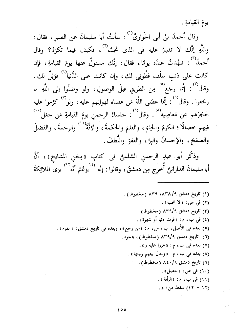 وَقَالَ أَحْمَدُ بْنُ أَبِي الْحَوَارِيِّ: سَأَلْتُ أَبَا سُلَيْمَانَ عَنِ الصَّبْرِ، فَقَالَ: وَاللَّهِ إِنَّكَ لَا تَقْدِرُ عَلَيْهِ فِي الَّذِي تُحِبُّ، فَكَيْفَ فِيمَا تَكْرَهُ؟ قَالَ أَحْمَدُ: تَنَهَّدْتُ عِنْدَهُ يَوْمًا، فَقَالَ: إِنَّكَ مَسْئُولٌ عَنْهَا يَوْمَ الْقِيَامَةِ، فَإِنْ كَانَتْ عَلَى ذَنْبٍ سَلَفَ فَطُوبَى لَكَ، وَإِنْ كَانَتْ عَلَى الدُّنْيَا فَوَيْلٌ لَكَ. وَقَالَ: إِنَّمَا رَجَعَ مِنَ الطَّرِيقِ قَبْلَ الْوُصُولِ، وَلَوْ وَصَلُوا إِلَى اللَّهِ مَا رَجَعُوا. وَقَالَ: إِنَّمَا عَصَى اللَّهَ مَنْ عَصَاهُ لِهَوَانِهِمْ عَلَيْهِ، وَلَوْ كَرُمُوا عَلَيْهِ لَحَجَزَهُمْ عَنْ مَعَاصِيهِ. وَقَالَ: جُلَسَاءُ الرَّحْمَنِ يَوْمَ الْقِيَامَةِ مَنْ جَعَلَ فِيهِمْ خِصَالًا: الْكَرَمَ وَالْحِلْمَ، وَالْعِلْمَ وَالْحِكْمَةَ، وَالرِّقَّةَ، وَالرَّحْمَةَ، وَالْفَضْلَ، وَالصَّفْحَ، وَالْإِحْسَانَ وَالْبِرَّ، وَالْعَفْوَ وَاللُّطْفَ.