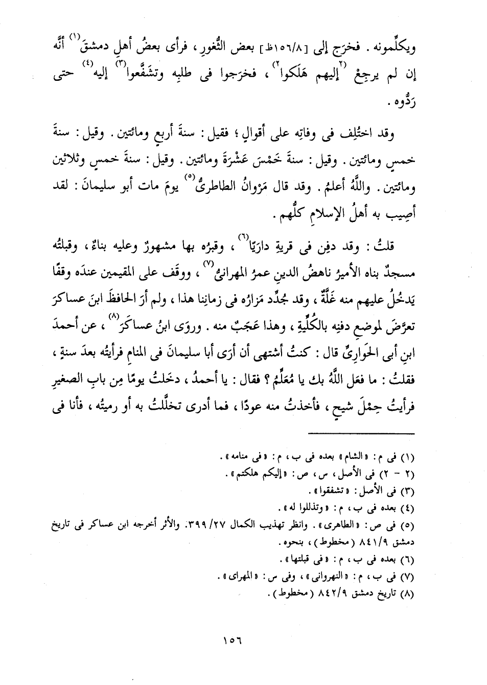 قُلْتُ: وَقَدْ دُفِنَ فِي قَرْيَةِ دَارَيَّا، وَقَبْرُهُ بِهَا مَشْهُورٌ وَعَلَيْهِ بِنَاءٌ، وَقِبْلَتُهُ مَسْجِدٌ بَنَاهُ الْأَمِيرُ نَاهِضُ الدِّينِ عُمَرُ الْمِهْرَانِيُّ، وَوَقَفَ عَلَى الْمُقِيمِينَ عِنْدَهُ وَقْفًا يَدْخُلُ عَلَيْهِمْ مِنْهُ غَلَّةٌ، وَقَدْ جَدَّدَ مَزَارَهُ فِي زَمَانِنَا هَذَا، وَلَمْ أَرَ الْحَافِظَ ابْنَ عَسَاكِرَ تَعَرَّضَ لِمَوْضِعِ دَفْنِهِ بِالْكُلِّيَّةِ، وَهَذَا عَجَبٌ مِنْهُ. وَرَوَى ابْنُ عَسَاكِرَ، عَنْ أَحْمَدَ بْنِ أَبِي الْحَوَارِيِّ قَالَ: كُنْتُ أَشْتَهِي أَنْ أَرَى أَبَا سُلَيْمَانَ فِي الْمَنَامِ فَرَأَيْتُهُ بَعْدَ سَنَةٍ، فَقُلْتُ: مَا فَعَلَ اللَّهُ بِكَ يَا مُعَلِّمُ؟ فَقَالَ: يَا أَحْمَدُ، دَخَلْتُ يَوْمًا مِنْ بَابِ الصَّغِيرِ فَرَأَيْتُ حِمْلَ شِيحٍ، فَأَخَذْتُ مِنْهُ عُودًا، فَمَا أَدْرِي تَخَلَّلْتُ بِهِ أَوْ رَمَيْتُهُ، فَأَنَا فِي