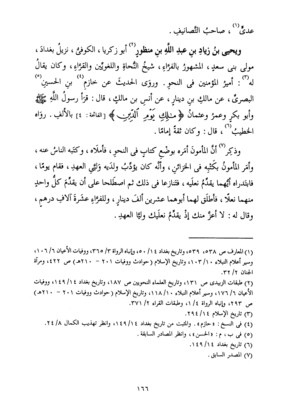 وَيَحْيَى بْنُ زِيَادِ بْنِ عَبْدِ اللَّهِ بْنِ مَنْظُورٍ أَبُو زَكَرِيَّا، الْكُوفِيُّ، نَزِيلُ بَغْدَادَ مَوْلَى بَنِي سَعْدٍ، الْمَشْهُورُ بِالْفَرَّاءِ، شَيْخُ النُّحَاةِ وَاللُّغَوِيِّينَ وَالْقُرَّاءِ، وَكَانَ يُقَالُ لَهُ: أَمِيرُ الْمُؤْمِنِينَ فِي النَّحْوِ. وَرَوَى الْحَدِيثَ عَنْ خَازِمِ بْنِ الْحُسَيْنِ الْبَصْرِيِّ، عَنْ مَالِكِ بْنِ دِينَارٍ عَنْ أَنَسِ بْنِ مَالِكٍ قَالَ: «قَرَأَ رَسُولُ اللَّهِ صَلَّى اللَّهُ عَلَيْهِ وَسَلَّمَ وَأَبُو بَكْرٍ وَعُمَرُ وَعُثْمَانُ {مَالِكِ يَوْمِ الدِّينِ} [الفاتحة: 4] بِالْأَلِفِ» . رَوَاهُ الْخَطِيبُ، قَالَ: وَكَانَ ثِقَةً إِمَامًا.