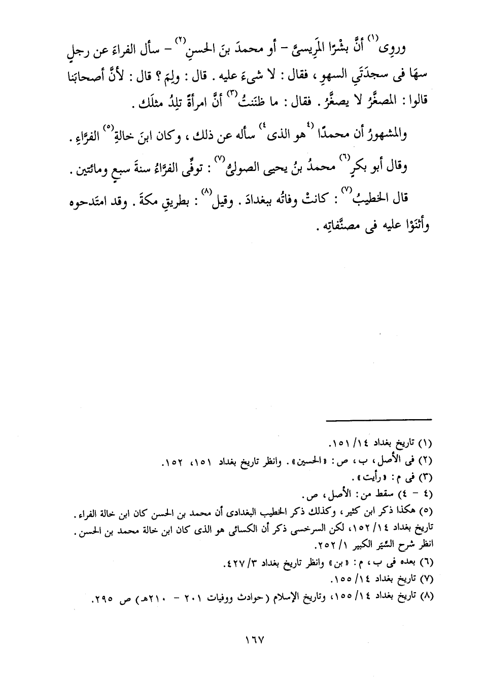 وَالْمَشْهُورُ أَنَّ مُحَمَّدًا هُوَ الَّذِي سَأَلَهُ عَنْ ذَلِكَ، وَكَانَ ابْنَ خَالَةِ الْفَرَّاءِ