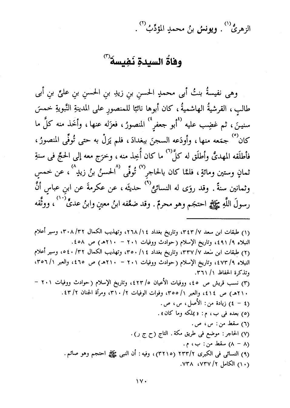 وَهِيَ نَفِيسَةُ بِنْتُ أَبِي مُحَمَّدٍ الْحَسَنِ بْنِ زَيْدِ بْنِ الْحَسَنِ بْنِ عَلِيِّ بْنِ أَبِي طَالِبٍ، الْقُرَشِيَّةُ الْهَاشِمِيَّةُ كَانَ أَبُوهَا نَائِبًا لِلْمَنْصُورِ عَلَى الْمَدِينَةِ النَّبَوِيَّةِ خَمْسَ سِنِينَ، ثُمَّ غَضِبَ عَلَيْهِ أَبُو جَعْفَرٍ الْمَنْصُورُ فَعَزَلَهُ عَنْهَا، وَأَخَذَ مِنْهُ كُلَّ مَا كَانَ جَمَعَهُ مِنْهَا، وَأَوْدَعَهُ السِّجْنَ بِبَغْدَادَ، فَلَمْ يَزَلْ بِهِ حَتَّى تُوُفِّيَ الْمَنْصُورُ، فَأَطْلَقَهُ الْمَهْدِيُّ وَأَطْلَقَ لَهُ كُلَّ مَا كَانَ أُخِذَ مِنْهُ، وَخَرَجَ مَعَهُ إِلَى الْحَجِّ فِي سَنَةِ ثَمَانٍ وَسِتِّينَ وَمِائَةٍ، فَلَمَّا كَانَ بِالْحَاجِرِ تُوُفِّيَ الْحَسَنُ بْنُ زَيْدٍ عَنْ خَمْسٍ وَثَمَانِينَ سَنَةً. وَقَدْ رَوَى لَهُ النَّسَائِيُّ حَدِيثَهُ، عَنْ عِكْرِمَةَ عَنِ ابْنِ عَبَّاسٍ أَنَّ رَسُولَ اللَّهِ صَلَّى اللَّهُ عَلَيْهِ وَسَلَّمَ «احْتَجَمَ وَهُوَ مُحْرِمٌ» . وَقَدْ ضَعَّفَهُ ابْنُ مَعِينٍ وَابْنُ عَدِيٍّ، وَوَثَّقَهُ