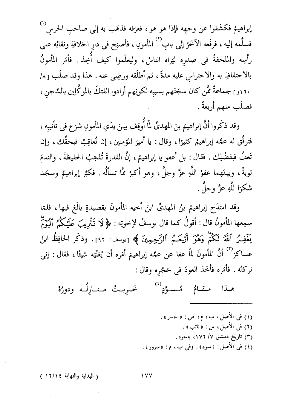 وَقَدِ امْتَدَحَ إِبْرَاهِيمُ بْنُ الْمَهْدِيِّ ابْنَ أَخِيهِ الْمَأْمُونَ بِقَصِيدَةٍ بَالَغَ فِيهَا، فَلَمَّا سَمِعَهَا الْمَأْمُونُ قَالَ: أَقُولُ كَمَا قَالَ يُوسُفُ لِإِخْوَتِهِ: {لَا تَثْرِيبَ عَلَيْكُمُ الْيَوْمَ يَغْفِرُ اللَّهُ لَكُمْ وَهُوَ أَرْحَمُ الرَّاحِمِينَ} [يوسف: 92] وَذَكَرَ الْحَافِظُ ابْنُ عَسَاكِرَ أَنَّ الْمَأْمُونَ لَمَّا عَفَا عَنْ عَمِّهِ إِبْرَاهِيمَ أَمَرَهُ أَنْ يُغَنِّيَهُ شَيْئًا، فَقَالَ: إِنِّي تَرَكْتُهُ. فَأَمَرَهُ فَأَخَذَ الْعُودَ فِي حِجْرِهِ، وَقَالَ: