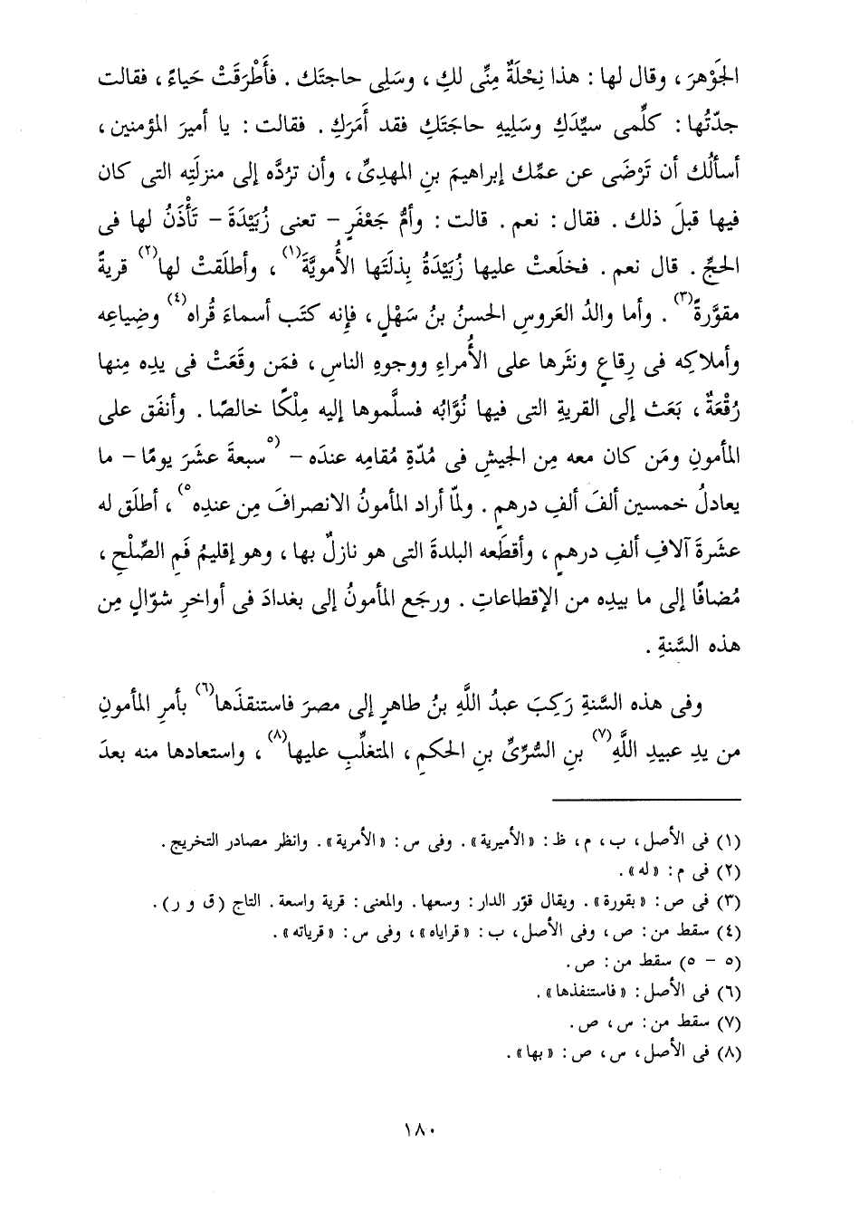 الْجَوْهَرَ، وَقَالَ لَهَا: هَذَا نِحْلَةٌ مِنِّي لَكِ، وَسَلِي حَاجَتِكَ. فَأَطْرَقَتْ حَيَاءً، فَقَالَتْ جَدَّتُهَا: كَلِّمِي سَيِّدَكِ وَسَلِيهِ حَاجَتَكِ فَقَدْ أَمَرَكِ. فَقَالَتْ: يَا أَمِيرَ الْمُؤْمِنِينَ، أَسْأَلُكَ أَنْ تَرْضَى عَنْ عَمِّكَ إِبْرَاهِيمَ بْنِ الْمَهْدِيِّ وَأَنْ تَرُدَّهُ إِلَى مَنْزِلَتِهِ الَّتِي كَانَ فِيهَا قَبْلَ ذَلِكَ. فَقَالَ: نَعَمْ. قَالَتْ: وَأُمُّ جَعْفَرٍ تَعْنِي زُبَيْدَةَ تَأْذَنُ لَهَا فِي الْحَجِّ. قَالَ: نَعَمْ. فَخَلَعَتْ عَلَيْهَا زُبَيْدَةُ بِذْلَتَهَا الْأُمَوِيَّةَ، وَأَطْلَقَتْ لَهَا قَرْيَةً مُقَوَّرَةً. وَأَمَّا وَالِدُ الْعَرُوسِ الْحَسَنُ بْنُ سَهْلٍ فَإِنَّهُ كَتَبَ أَسْمَاءَ قُرَاهُ وَضِيَاعَهُ وَأَمْلَاكَهُ فِي رِقَاعٍ وَنَثَرَهَا عَلَى الْأُمَرَاءِ وَوُجُوهِ النَّاسِ، فَمَنْ وَقَعَتْ فِي يَدِهِ مِنْهَا رُقْعَةٌ، بَعَثَ إِلَى الْقَرْيَةِ الَّتِي فِيهَا نُوَّابُهُ فَسَلَّمَهَا إِلَيْهِ مِلْكًا خَالِصًا. وَأَنْفَقَ عَلَى الْمَأْمُونِ وَمَنْ كَانَ مَعَهُ مِنَ الْجَيْشِ فِي مُدَّةِ مُقَامِهِ عِنْدَهُ سَبْعَةَ عَشَرَ يَوْمًا مَا يُعَادِلُ خَمْسِينَ أَلْفَ أَلْفِ دِرْهَمٍ. وَلَمَّا أَرَادَ الْمَأْمُونُ الِانْصِرَافَ مِنْ عِنْدِهِ، أَطْلَقَ لَهُ عَشَرَةَ آلَافِ أَلْفِ دِرْهَمٍ، وَأَقْطَعَهُ الْبَلْدَةَ الَّتِي هُوَ نَازِلٌ بِهَا، وَهُوَ إِقْلِيمُ فَمِ الصِّلْحِ مُضَافًا إِلَى مَا بِيَدِهِ مِنَ الْإِقْطَاعَاتِ. وَرَجَعَ الْمَأْمُونُ إِلَى بَغْدَادَ فِي أَوَاخِرِ شَوَّالٍ مِنْ هَذِهِ السَّنَةِ.