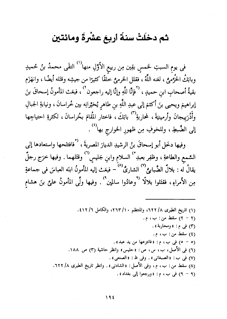 وَفِيهَا دَخَلَ أَبُو إِسْحَاقَ بْنُ الرَّشِيدِ الدِّيَارَ الْمِصْرِيَّةَ، فَافْتَتَحَهَا وَاسْتَعَادَهَا إِلَى السَّمْعِ وَالطَّاعَةِ، وَظَفِرَ بِعَبْدِ السَّلَامِ وَابْنِ جَلِيسٍ وَقَتَلَهُمَا. وَفِيهَا خَرَجَ رَجُلٌ يُقَالُ لَهُ: بِلَالٌ الضَّبَابِيُّ الشَّارِيُّ فَبَعَثَ إِلَيْهِ الْمَأْمُونُ ابْنَهُ الْعَبَّاسَ فِي جَمَاعَةٍ مِنَ الْأُمَرَاءِ، فَقَتَلُوا بِلَالًا وَعَادُوا سَالِمِينَ. وَفِيهَا وَلَّى الْمَأْمُونُ عَلِيَّ بْنَ هِشَامٍ