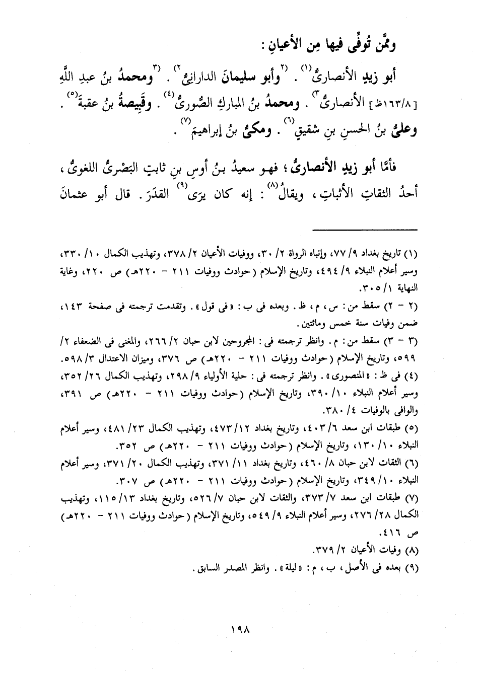 فَأَمَّا أَبُو زَيْدٍ الْأَنْصَارِيُّ؛ فَهُوَ سَعِيدُ بْنُ أَوْسِ بْنِ ثَابِتٍ الْبَصْرِيُّ اللُّغَوِيُّ أَحَدُ الثِّقَاتِ الْأَثْبَاتِ، وَيُقَالُ: إِنَّهُ كَانَ يَرَى الْقَدَرَ. قَالَ أَبُو عُثْمَانَ