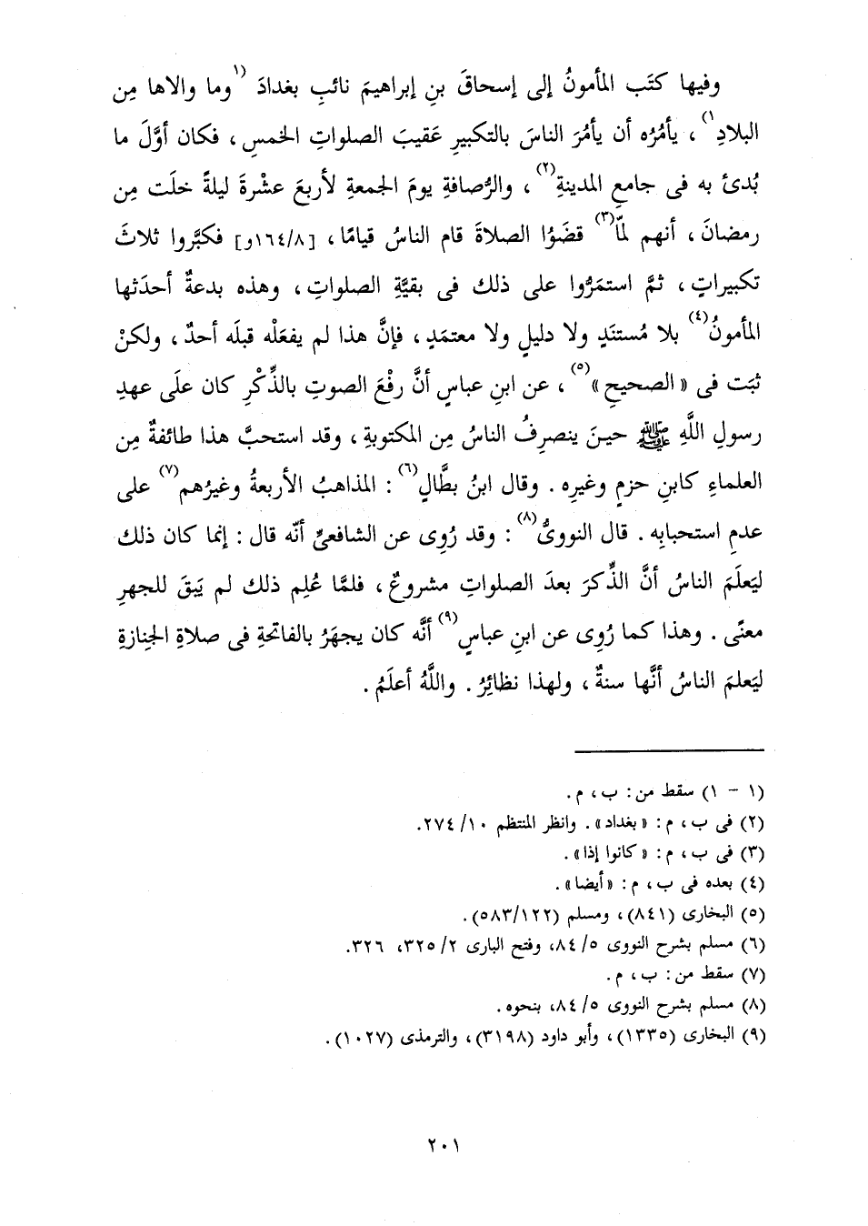 وَفِيهَا كَتَبَ الْمَأْمُونُ إِلَى إِسْحَاقَ بْنِ إِبْرَاهِيمَ نَائِبِ بَغْدَادَ وَمَا وَالَاهَا مِنَ الْبِلَادِ، يَأْمُرُهُ أَنْ يَأْمُرَ النَّاسَ بِالتَّكْبِيرِ عَقِيبَ الصَّلَوَاتِ الْخَمْسِ فَكَانَ أَوَّلَ مَا بُدِئَ بِهِ فِي جَامِعِ الْمَدِينَةِ وَالرُّصَافَةِ يَوْمَ الْجُمُعَةِ لِأَرْبَعَ عَشْرَةَ لَيْلَةً خَلَتْ مِنْ رَمَضَانَ، أَنَّهُمْ لَمَّا قَضَوُا الصَّلَاةَ قَامَ النَّاسُ قِيَامًا فَكَبَّرُوا ثَلَاثَ تَكْبِيرَاتٍ، ثُمَّ اسْتَمَرُّوا عَلَى ذَلِكَ فِي بَقِيَّةِ الصَّلَوَاتِ، وَهَذِهِ بِدْعَةٌ أَحْدَثَهَا الْمَأْمُونُ بِلَا مُسْتَنَدٍ وَلَا دَلِيلٍ وَلَا مُعْتَمَدٍ فَإِنَّ هَذَا لَمْ يَفْعَلْهُ قَبْلَهُ أَحَدٌ وَلَكِنْ ثَبَتَ فِي " " الصَّحِيحِ " " عَنِ ابْنِ عَبَّاسٍ أَنَّ رَفْعَ الصَّوْتِ بِالذِّكْرِ كَانَ عَلَى عَهْدِ رَسُولِ اللَّهِ صَلَّى اللَّهُ عَلَيْهِ وَسَلَّمَ حِينَ يَنْصَرِفُ النَّاسُ مِنَ الْمَكْتُوبَةِ. وَقَدِ اسْتَحَبَّ هَذَا طَائِفَةٌ مِنَ الْعُلَمَاءِ كَابْنِ حَزْمٍ وَغَيْرِهِ. وَقَالَ ابْنُ بَطَّالٍ: الْمَذَاهِبُ الْأَرْبَعَةُ وَغَيْرُهُمْ عَلَى عَدَمِ اسْتِحْبَابِهِ. قَالَ النَّوَوِيُّ: وَقَدْ رُوِيَ عَنِ الشَّافِعِيِّ أَنَّهُ قَالَ: إِنَّمَا كَانَ ذَلِكَ لِيَعْلَمَ النَّاسُ أَنَّ الذِّكْرَ بَعْدَ الصَّلَوَاتِ مَشْرُوعٌ، فَلَمَّا عُلِمَ ذَلِكَ لَمْ يَبْقَ لِلْجَهْرِ مَعْنًى. وَهَذَا كَمَا رُوِيَ عَنِ ابْنِ عَبَّاسٍ أَنَّهُ كَانَ يَجْهَرُ بِالْفَاتِحَةِ فِي صَلَاةِ الْجِنَازَةِ لِيَعْلَمَ النَّاسُ أَنَّهَا سُنَّةٌ، وَلِهَذَا نَظَائِرُ، وَاللَّهُ أَعْلَمُ.
