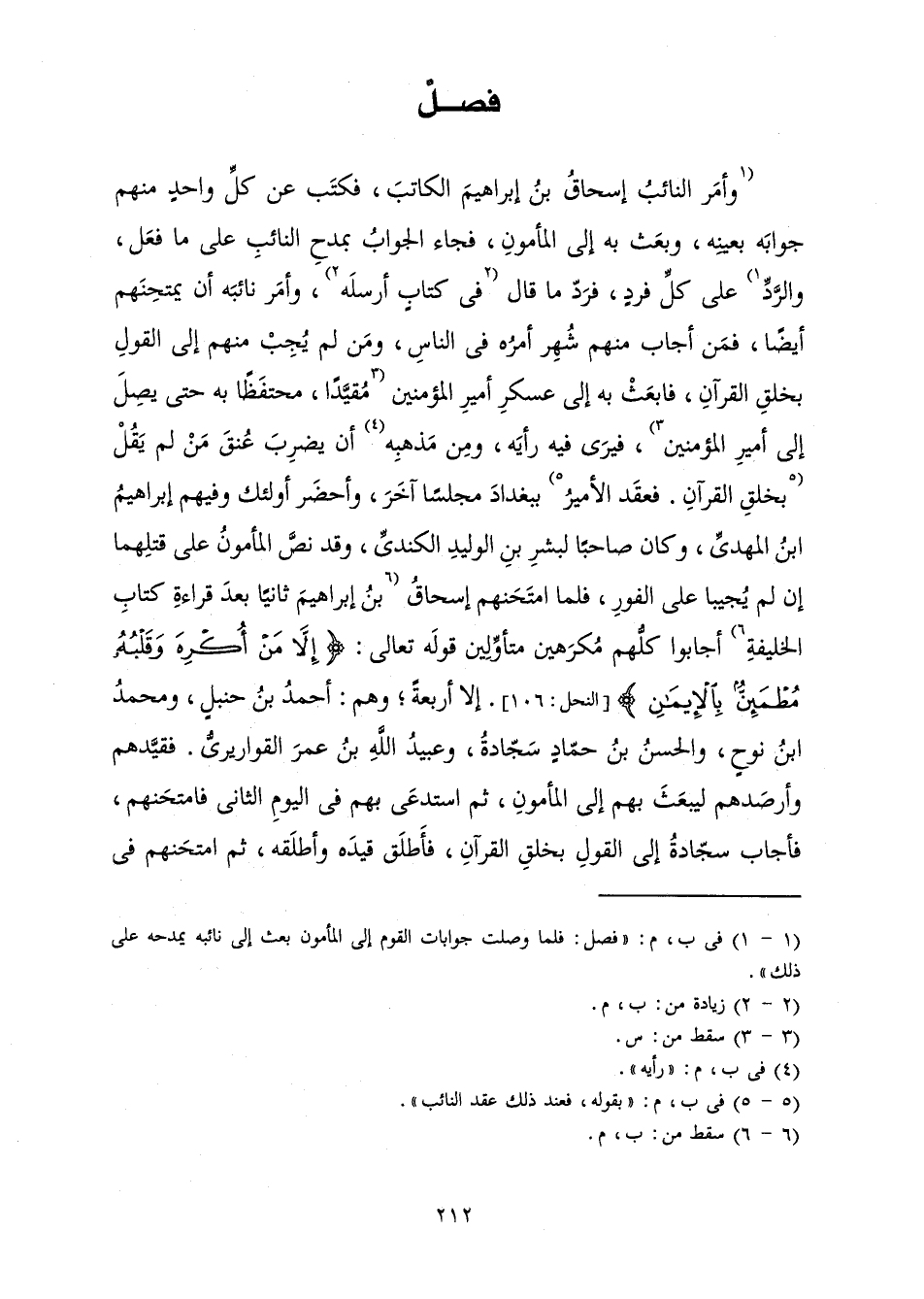 وَأَمَرَ النَّائِبُ إِسْحَاقُ بْنُ إِبْرَاهِيمَ الْكَاتِبَ، فَكَتَبَ عَنْ كُلِّ وَاحِدٍ مِنْهُمْ جَوَابَهُ بِعَيْنِهِ، وَبَعَثَ بِهِ إِلَى الْمَأْمُونِ فَجَاءَ الْجَوَابُ بِمَدْحِ النَّائِبِ عَلَى مَا فَعَلَ، وَالرَّدِّ عَلَى كُلِّ فَرْدٍ، فَرَدَّ مَا قَالَ فِي كِتَابٍ أَرْسَلَهُ، وَأَمَرَ نَائِبَهُ أَنْ يَمْتَحِنَهُمْ أَيْضًا، فَمَنْ أَجَابَ مِنْهُمْ شُهِرَ أَمْرُهُ فِي النَّاسِ، وَمَنْ لَمْ يُجِبْ مِنْهُمْ إِلَى الْقَوْلِ بِخَلْقِ الْقُرْآنِ، فَابْعَثْ بِهِ إِلَى عَسْكَرِ أَمِيرِ الْمُؤْمِنِينَ مُقَيَّدًا، مُحْتَفَظًا بِهِ حَتَّى يَصِلَ إِلَى أَمِيرِ الْمُؤْمِنِينَ فَيَرَى فِيهِ رَأْيَهُ، وَمِنْ مَذْهَبِهِ أَنْ يَضْرِبَ عُنُقَ مَنْ لَمْ يَقُلْ بِخَلْقِ الْقُرْآنِ. فَعَقَدَ الْأَمِيرُ بِبَغْدَادَ مَجْلِسًا آخَرَ، وَأَحْضَرَ أُولَئِكَ وَفِيهِمْ إِبْرَاهِيمُ بْنُ الْمَهْدِيِّ وَكَانَ صَاحِبًا لِبِشْرِ بْنِ الْوَلِيدِ الْكِنْدِيِّ، وَقَدْ نَصَّ الْمَأْمُونُ عَلَى قَتْلِهِمَا إِنْ لَمْ يُجِيبَا عَلَى الْفَوْرِ، فَلَمَّا امْتَحَنَهُمْ إِسْحَاقُ بْنُ إِبْرَاهِيمَ ثَانِيًا بَعْدَ قِرَاءَةِ كِتَابِ الْخَلِيفَةِ أَجَابُوا كُلُّهُمْ مُكْرَهِينَ مُتَأَوِّلِينَ قَوْلَهُ تَعَالَى {إِلَّا مَنْ أُكْرِهَ وَقَلْبُهُ مُطْمَئِنٌّ بِالْإِيمَانِ} [النحل: 106] إِلَّا أَرْبَعَةً؛ وَهُمْ: أَحْمَدُ بْنُ حَنْبَلٍ، وَمُحَمَّدُ بْنُ نُوحٍ، وَالْحَسَنُ بْنُ حَمَّادٍ سَجَّادَةُ، وَعُبَيْدُ اللَّهِ بْنُ عُمَرَ الْقَوَارِيرِيُّ. فَقَيَّدَهُمْ وَأَرْصَدَهُمْ لِيَبْعَثَ بِهِمْ إِلَى الْمَأْمُونِ ثُمَّ اسْتَدْعَى بِهِمْ فِي الْيَوْمِ الثَّانِي فَامْتَحَنَهُمْ، فَأَجَابَ سَجَّادَةُ إِلَى الْقَوْلِ بِخَلْقِ الْقُرْآنِ، فَأَطْلَقَ قَيْدَهُ وَأَطْلَقَهُ، ثُمَّ امْتَحَنَهُمْ فِي