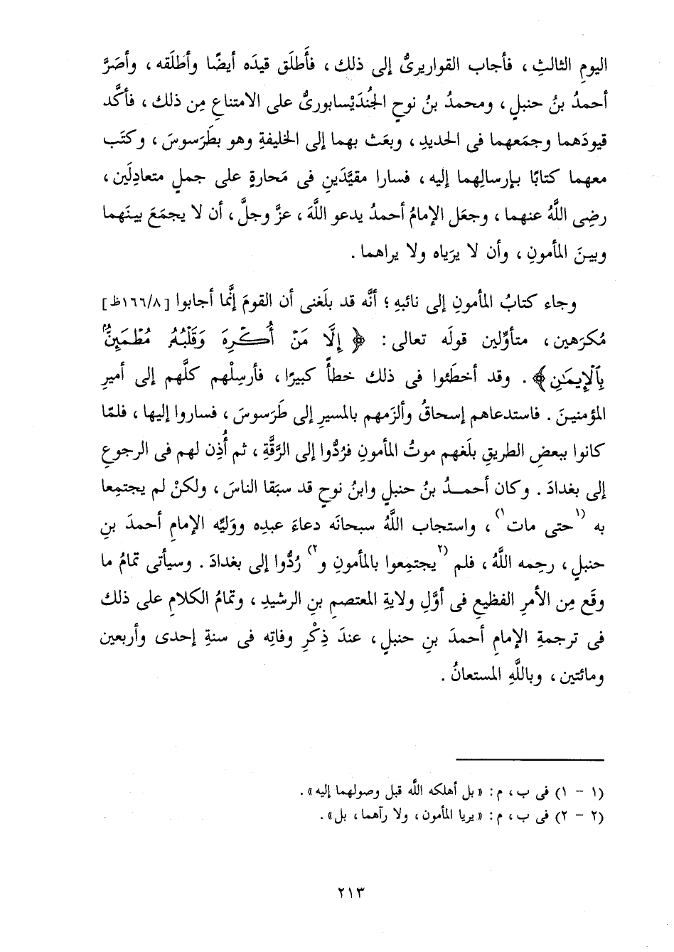 وَجَاءَ كِتَابُ الْمَأْمُونِ إِلَى نَائِبِهِ؛ أَنَّهُ قَدْ بَلَغَنِي أَنَّ الْقَوْمَ إِنَّمَا أَجَابُوا مُكْرَهِينَ، مُتَأَوِّلِينَ قَوْلَهُ تَعَالَى {إِلَّا مَنْ أُكْرِهَ وَقَلْبُهُ مُطْمَئِنٌّ بِالْإِيمَانِ} [النحل: 106] وَقَدْ أَخْطَئُوا فِي ذَلِكَ خَطَأً كَبِيرًا فَأَرْسِلْهُمْ كُلَّهُمْ إِلَى أَمِيرِ الْمُؤْمِنِينَ. فَاسْتَدْعَاهُمْ إِسْحَاقُ وَأَلْزَمَهُمْ بِالْمَسِيرِ إِلَى طَرَسُوسَ فَسَارُوا إِلَيْهَا، فَلَمَّا كَانُوا بِبَعْضِ الطَّرِيقِ بَلَغَهُمْ مَوْتُ الْمَأْمُونِ فَرُدُّوا إِلَى الرَّقَّةِ ثُمَّ أُذِنَ لَهُمْ فِي الرُّجُوعِ إِلَى بَغْدَادَ. وَكَانَ أَحْمَدُ بْنُ حَنْبَلٍ، وَابْنُ نُوحٍ قَدْ سَبَقَا النَّاسَ، وَلَكِنْ لَمْ يَجْتَمِعَا بِهِ حَتَّى مَاتَ، وَاسْتَجَابَ اللَّهُ سُبْحَانَهُ دُعَاءَ عَبْدِهِ وَوَلِيِّهِ الْإِمَامُ أَحْمَدُ بْنُ حَنْبَلٍ، رَحِمَهُ اللَّهُ، فَلَمْ يَجْتَمِعُوا بِالْمَأْمُونِ، وَرُدُّوا إِلَى بَغْدَادَ وَسَيَأْتِي تَمَامُ مَا وَقَعَ مِنَ الْأَمْرِ الْفَظِيعِ فِي أَوَّلِ وِلَايَةِ الْمُعْتَصِمِ بْنِ الرَّشِيدِ، وَتَمَامُ الْكَلَامِ عَلَى ذَلِكَ فِي تَرْجَمَةِ الْإِمَامِ أَحْمَدَ بْنِ حَنْبَلٍ، عِنْدَ ذِكْرِ وَفَاتِهِ فِي سَنَةِ إِحْدَى وَأَرْبَعِينَ وَمِائَتَيْنِ، وَبِاللَّهِ الْمُسْتَعَانُ.