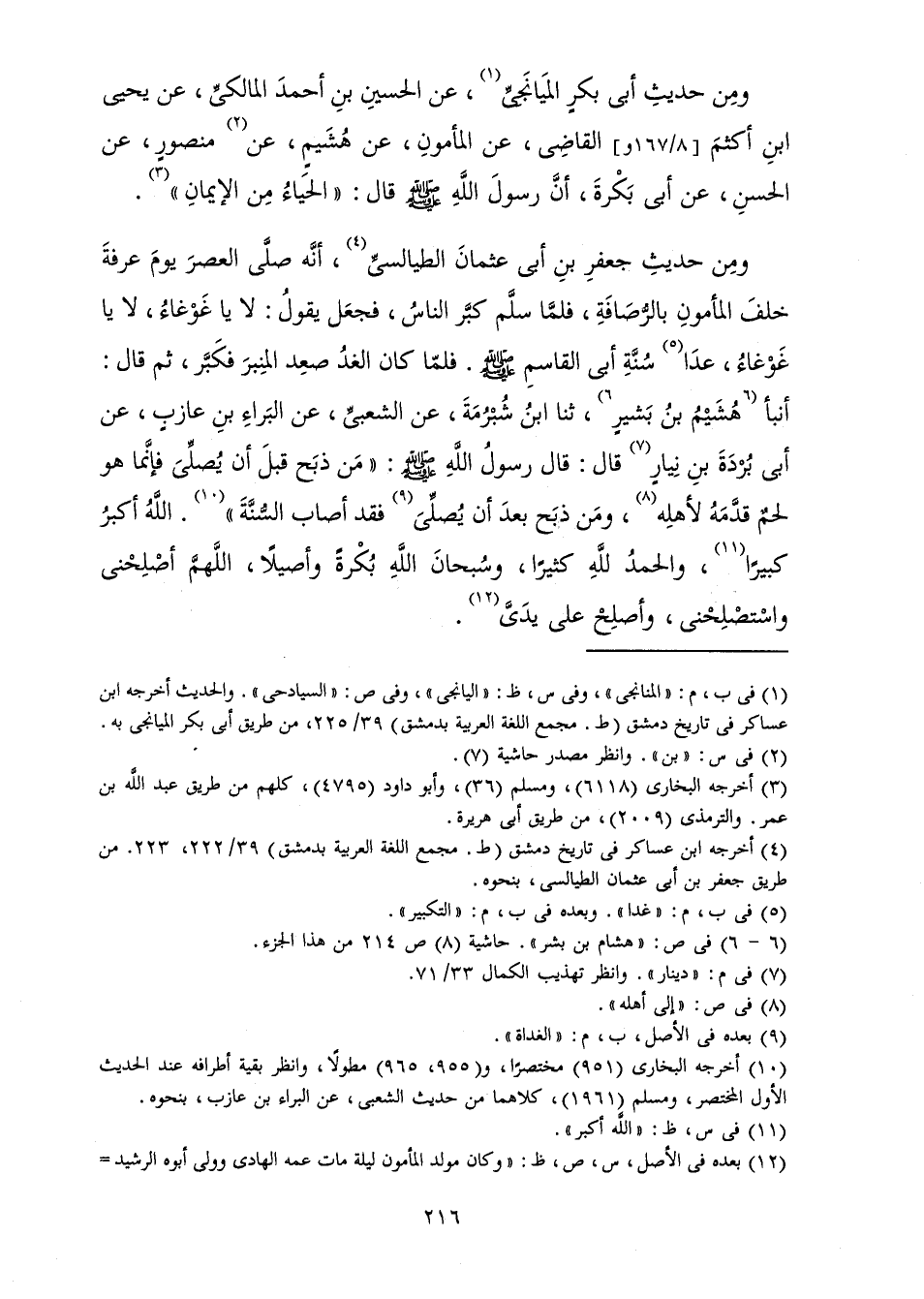 وَمِنْ حَدِيثِ جَعْفَرِ بْنِ أَبِي عُثْمَانَ الطَّيَالِسِيِّ أَنَّهُ صَلَّى الْعَصْرَ يَوْمَ عَرَفَةَ خَلْفَ الْمَأْمُونِ بِالرُّصَافَةِ، فَلَمَّا سَلَّمَ كَبَّرَ النَّاسُ، فَجَعَلَ يَقُولُ: لَا يَا غَوْغَاءُ، لَا يَا غَوْغَاءُ، عَدَا سُنَّةِ أَبِي الْقَاسِمِ صَلَّى اللَّهُ عَلَيْهِ وَسَلَّمَ. فَلَمَّا كَانَ الْغَدُ صَعِدَ الْمِنْبَرَ فَكَبَّرَ، ثُمَّ قَالَ: أَنْبَأَ هُشَيْمُ بْنُ بَشِيرٍ، ثنا ابْنُ شُبْرُمَةَ عَنِ الشَّعْبِيِّ، عَنِ الْبَرَاءِ بْنِ عَازِبٍ عَنْ أَبِي بُرْدَةَ بْنِ نِيَارٍ قَالَ: قَالَ رَسُولُ اللَّهِ، صَلَّى اللَّهُ عَلَيْهِ وَسَلَّمَ: «مَنْ ذَبَحَ قَبْلَ أَنْ يُصَلِّيَ فَإِنَّمَا هُوَ لَحْمٌ قَدَّمَهُ لِأَهْلِهِ، وَمَنْ ذَبَحَ بَعْدَ أَنْ يُصَلِّيَ فَقَدْ أَصَابَ السُّنَّةَ» اللَّهُ أَكْبَرُ كَبِيرًا، وَالْحَمْدُ لِلَّهِ كَثِيرًا، وَسُبْحَانَ اللَّهِ بُكْرَةً وَأَصِيلًا، اللَّهُمَّ أَصْلِحْنِي، وَاسْتَصْلِحْنِي، وَأَصْلِحْ عَلَى يَدَيَّ.