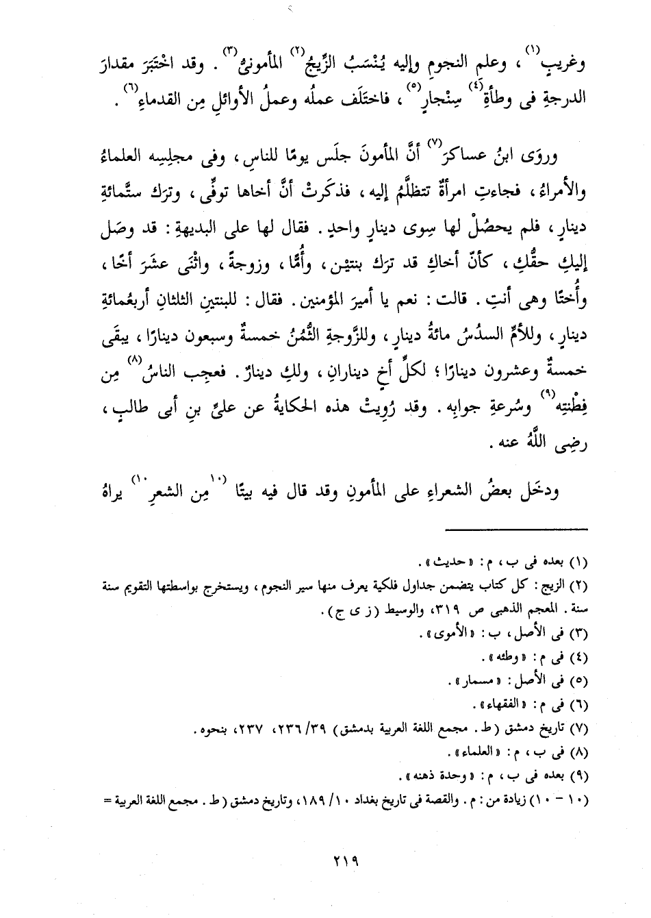 وَغَرِيبٍ، وَعِلْمِ النُّجُومِ، وَإِلَيْهِ يُنْسَبُ الزِّيجُ الْمَأْمُونِيُّ، وَقَدِ اخْتَبَرَ مِقْدَارَ الدَّرَجَةِ فِي وَطْأَةِ سِنْجَارَ فَاخْتَلَفَ عَمَلُهُ وَعَمَلُ الْأَوَائِلِ مِنَ الْقُدَمَاءِ.