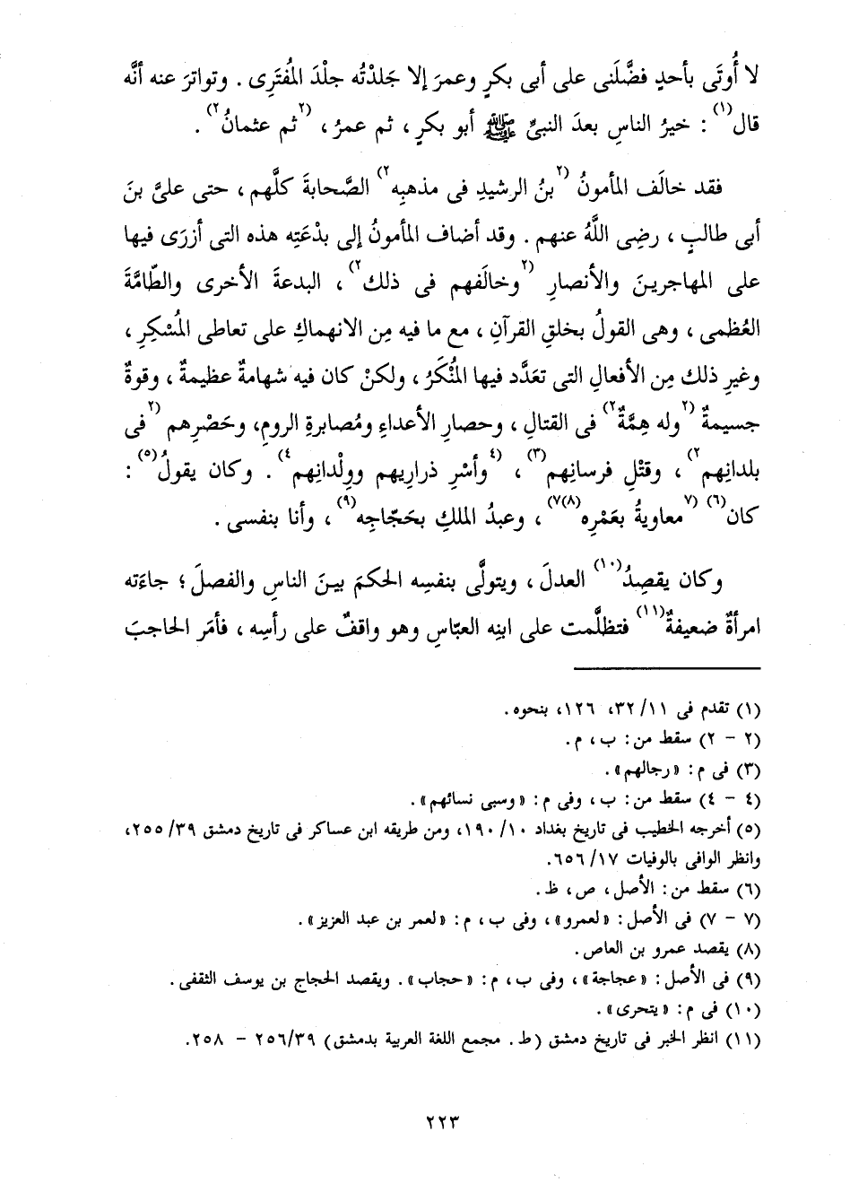 فَقَدْ خَالَفَ الْمَأْمُونُ بْنُ الرَّشِيدِ فِي مَذْهَبِهِ الصَّحَابَةَ كُلَّهُمْ، حَتَّى عَلِيَّ بْنَ أَبِي طَالِبٍ رَضِيَ اللَّهُ عَنْهُ. وَقَدْ أَضَافَ الْمَأْمُونُ إِلَى بِدْعَتِهِ هَذِهِ الَّتِي أَزْرَى فِيهَا عَلَى الْمُهَاجِرِينَ وَالْأَنْصَارِ وَخَالَفَهُمْ فِي ذَلِكَ، الْبِدْعَةَ الْأُخْرَى، وَالطَّامَّةَ الْعُظْمَى، وَهِيَ الْقَوْلُ بِخَلْقِ الْقُرْآنِ مَعَ مَا فِيهِ مِنَ الِانْهِمَاكِ عَلَى تَعَاطِي الْمُسْكِرِ، وَغَيْرِ ذَلِكَ مِنَ الْأَفْعَالِ الَّتِي تَعَدَّدَ فِيهَا الْمُنْكَرُ، وَلَكِنْ كَانَ فِيهِ شَهَامَةٌ عَظِيمَةٌ، وَقُوَّةٌ جَسِيمَةٌ وَلَهُ هِمَّةٌ فِي الْقِتَالِ، وَحِصَارِ الْأَعْدَاءِ، وَمُصَابَرَةِ الرُّومِ، وَحَصْرِهِمْ فِي بُلْدَانِهِمْ، وَقَتْلِ فُرْسَانِهِمْ، وَأَسْرِ ذَرَارِيهِمْ وَوِلْدَانِهِمْ. وَكَانَ يَقُولُ: كَانَ مُعَاوِيَةُ بِعَمْرِهِ، وَعَبْدُ الْمَلِكِ بِحَجَّاجِهِ، وَأَنَا بِنَفْسِي.