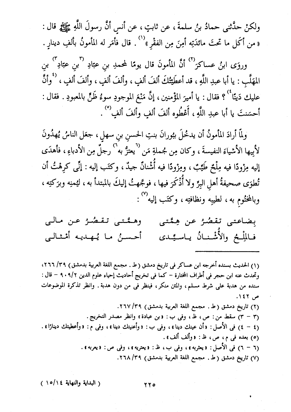 وَلَكِنْ حَدَّثَنِي حَمَّادُ بْنُ سَلَمَةَ عَنْ ثَابِتٍ، عَنْ أَنَسٍ أَنَّ رَسُولَ اللَّهِ صَلَّى اللَّهُ عَلَيْهِ وَسَلَّمَ قَالَ: «مَنْ أَكَلَ مَا تَحْتَ مَائِدَتِهِ أَمِنَ مِنَ الْفَقْرِ» قَالَ: فَأَمَرَ لَهُ الْمَأْمُونُ بِأَلْفِ دِينَارٍ.