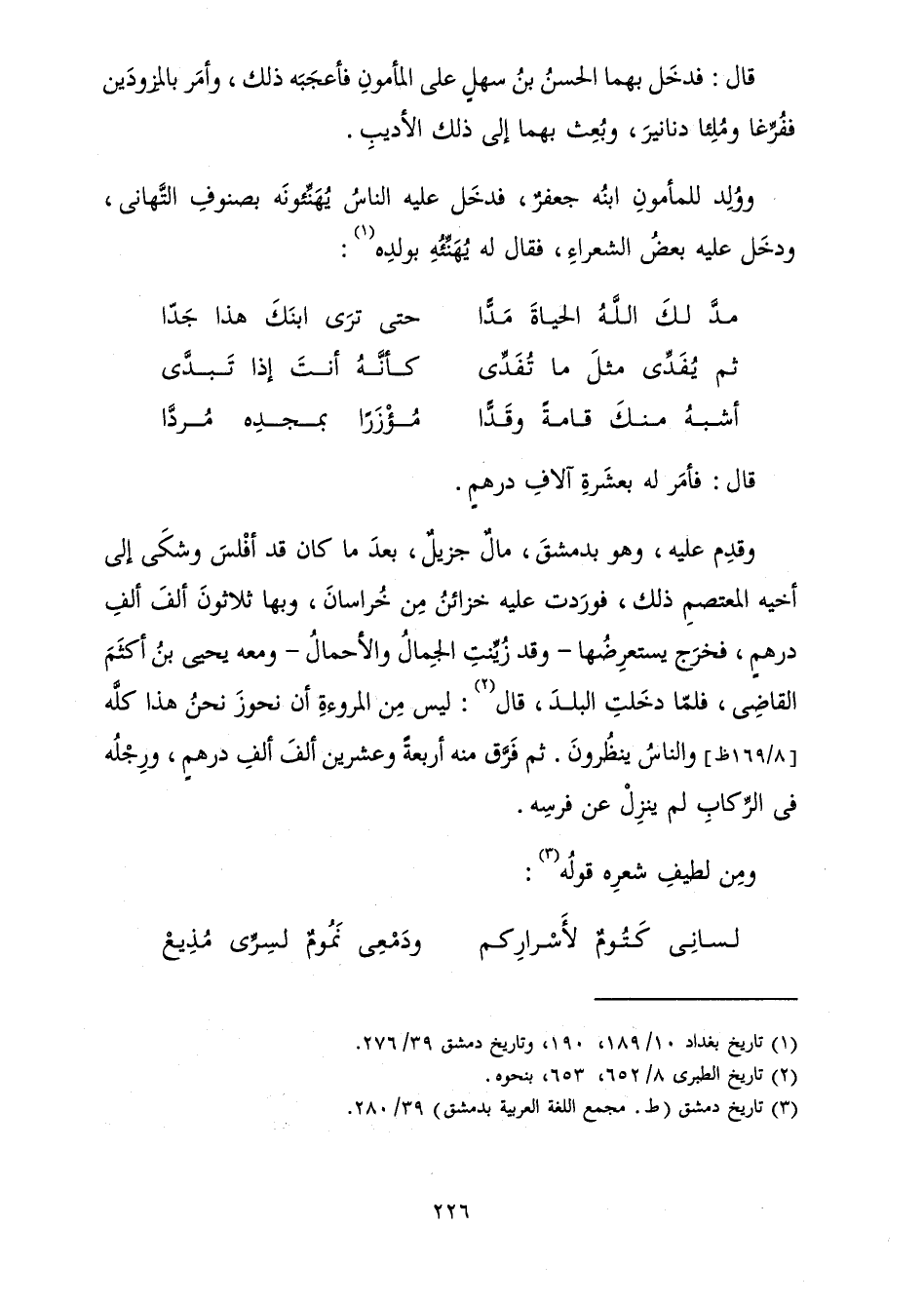 وَوُلِدَ لِلْمَأْمُونِ ابْنُهُ جَعْفَرٌ فَدَخَلَ عَلَيْهِ النَّاسُ يُهَنِّئُونَهُ بِصُنُوفِ التَّهَانِي، وَدَخَلَ عَلَيْهِ بَعْضُ الشُّعَرَاءِ، فَقَالَ لَهُ يُهَنِّئُهُ بِوَلَدِهِ: