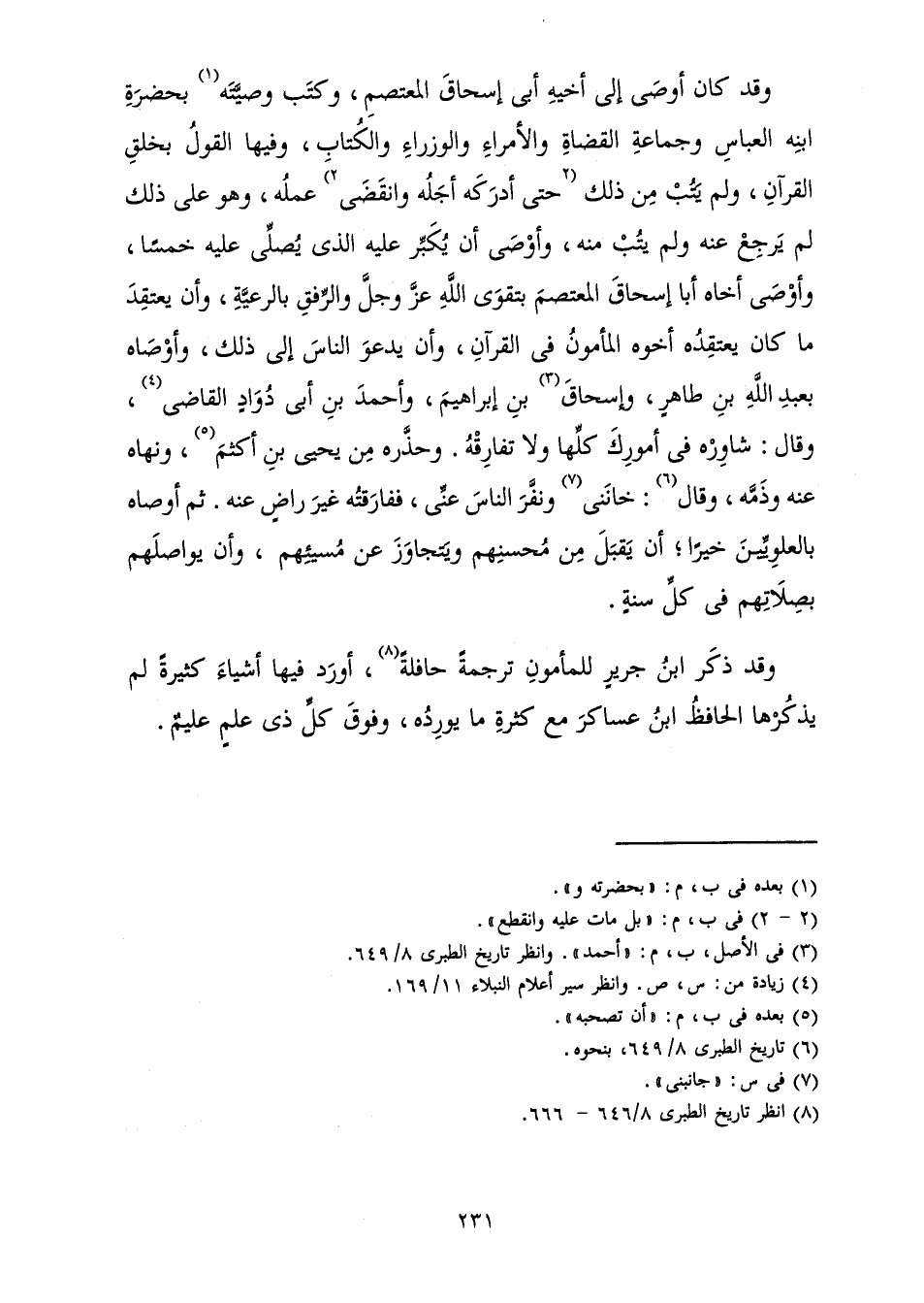 وَقَدْ كَانَ أَوْصَى إِلَى أَخِيهِ أَبِي إِسْحَاقَ الْمُعْتَصِمِ، وَكَتَبَ وَصِيَّتَهُ بِحَضْرَةِ ابْنِهِ الْعَبَّاسِ، وَجَمَاعَةِ الْقُضَاةِ وَالْأُمَرَاءِ وَالْوُزَرَاءِ وَالْكُتَّابِ، وَفِيهَا الْقَوْلُ بِخَلْقِ الْقُرْآنِ، وَلَمْ يَتُبْ مِنْ ذَلِكَ حَتَّى أَدْرَكَهُ أَجَلُهُ وَانْقَضَى عَمَلُهُ، وَهُوَ عَلَى ذَلِكَ لَمْ يَرْجِعْ عَنْهُ وَلَمْ يَتُبْ مِنْهُ، وَأَوْصَى أَنْ يُكَبِّرَ عَلَيْهِ الَّذِي يُصَلِّي عَلَيْهِ خَمْسًا، وَأَوْصَى أَخَاهُ أَبَا إِسْحَاقَ الْمُعْتَصِمَ بِتَقْوَى اللَّهِ عَزَّ وَجَلَّ وَالرِّفْقِ بِالرَّعِيَّةِ، وَأَنْ يَعْتَقِدَ مَا كَانَ يَعْتَقِدُهُ أَخُوهُ الْمَأْمُونُ فِي الْقُرْآنِ، وَأَنْ يَدْعُوَ النَّاسَ إِلَى ذَلِكَ، وَأَوْصَاهُ بِعَبْدِ اللَّهِ بْنِ طَاهِرٍ، وَإِسْحَاقَ بْنِ إِبْرَاهِيمَ، وَأَحْمَدَ بْنِ أَبِي دَاوُدَ الْقَاضِي، وَقَالَ: شَاوِرْهُ فِي أُمُورِكَ كُلِّهَا وَلَا تُفَارِقْهُ، وَحَذَّرَهُ مِنْ يَحْيَى بْنِ أَكْثَمَ وَنَهَاهُ عَنْهُ وَذَمَّهُ، وَقَالَ: خَانَنِي وَنَفَّرَ النَّاسَ عَنِّي، فَفَارَقْتُهُ غَيْرَ رَاضٍ عَنْهُ، ثُمَّ أَوْصَاهُ بِالْعَلَوِيِّينَ خَيْرًا؛ أَنْ يَقْبَلَ مِنْ مُحْسِنِهِمْ، وَيَتَجَاوَزَ عَنْ مُسِيئِهِمْ، وَأَنْ يُوَاصِلَهُمْ بِصِلَاتِهِمْ فِي كُلِّ سَنَةٍ.