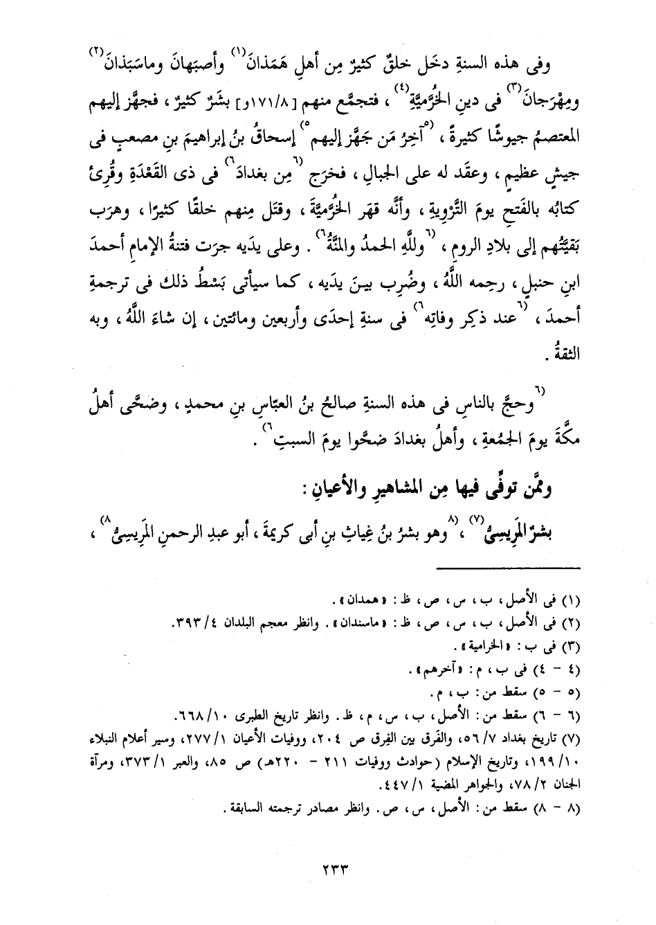 وَفِي هَذِهِ السَّنَةِ دَخَلَ خَلْقٌ كَثِيرٌ مِنْ أَهْلِ هَمَذَانَ وَأَصْبَهَانَ وَمَاسَبَذَانَ، وَمِهْرَجَانَ فِي دِينِ الْخُرَّمِيَّةِ، فَتَجَمَّعَ مِنْهُمْ بَشَرٌ كَثِيرٌ فَجَهَّزَ إِلَيْهِمِ الْمُعْتَصِمُ جُيُوشًا كَثِيرَةً، آخِرُ مَنْ جَهَّزَ إِلَيْهِمْ إِسْحَاقُ بْنُ إِبْرَاهِيمَ بْنِ مُصْعَبٍ فِي جَيْشٍ عَظِيمٍ، وَعَقَدَ لَهُ عَلَى الْجِبَالِ فَخَرَجَ مِنْ بَغْدَادَ فِي ذِي الْقَعْدَةِ، وَقُرِئَ كِتَابُهُ بِالْفَتْحِ يَوْمَ التَّرْوِيَةِ، وَأَنَّهُ قَهَرَ الْخُرَّمِيَّةَ، وَقَتَلَ مِنْهُمْ خَلْقًا كَثِيرًا، وَهَرَبَ بَقِيَّتُهُمْ إِلَى بِلَادِ الرُّومِ، وَلِلَّهِ الْحَمْدُ وَالْمِنَّةُ. وَعَلَى يَدَيْهِ جَرَتْ فِتْنَةُ الْإِمَامِ أَحْمَدَ بْنِ حَنْبَلٍ وَضُرِبَ بَيْنَ يَدَيْهِ كَمَا سَيَأْتِي بَسْطُ ذَلِكَ فِي تَرْجَمَةِ أَحْمَدَ عِنْدَ ذِكْرِ وَفَاتِهِ فِي سَنَةِ إِحْدَى وَأَرْبَعِينَ وَمِائَتَيْنِ، إِنْ شَاءَ اللَّهُ وَبِهِ الثِّقَةُ.