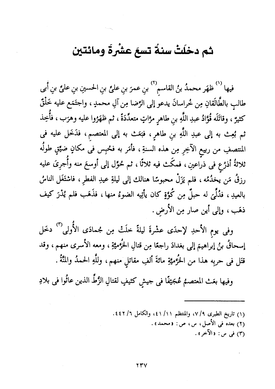 فِيهَا ظَهَرَ مُحَمَّدُ بْنُ الْقَاسِمِ بْنِ عُمَرَ بْنِ عَلِيِّ بْنِ الْحُسَيْنِ بْنِ عَلِيِّ بْنِ أَبِي طَالِبٍ بِالطَّالَقَانِ مِنْ خُرَاسَانَ يَدْعُو إِلَى الرِّضَا مِنْ آلِ مُحَمَّدٍ، وَاجْتَمَعَ عَلَيْهِ خَلْقٌ كَثِيرٌ، وَقَاتَلَهُ قُوَّادُ عَبْدِ اللَّهِ بْنِ طَاهِرٍ مَرَّاتٍ مُتَعَدِّدَةً، ثُمَّ ظَهَرُوا عَلَيْهِ وَهَرَبَ فَأُخِذَ ثُمَّ بُعِثَ بِهِ إِلَى عَبْدِ اللَّهِ بْنِ طَاهِرٍ، فَبَعَثَ بِهِ إِلَى الْمُعْتَصِمِ، فَدَخَلَ عَلَيْهِ فِي الْمُنْتَصَفِ مِنْ رَبِيعٍ الْآخِرِ مِنْ هَذِهِ السَّنَةِ، فَأَمَرَ بِهِ فَحُبِسَ فِي مَكَانٍ ضَيِّقٍ طُولُهُ ثَلَاثَةُ أَذْرُعٍ فِي ذِرَاعَيْنِ، فَمَكَثَ فِيهِ ثَلَاثًا، ثُمَّ حُوِّلَ إِلَى أَوْسَعَ مِنْهُ وَأُجْرِيَ عَلَيْهِ رِزْقُ مَنْ يَخْدُمُهُ، فَلَمْ يَزَلْ مَحْبُوسًا هُنَالِكَ إِلَى لَيْلَةِ عِيدِ الْفِطْرِ، فَاشْتَغَلَ النَّاسُ بِالْعِيدِ فَدُلِّيَ لَهُ حَبْلٌ مِنْ كُوَّةٍ كَانَ يَأْتِيهِ الضَّوْءُ مِنْهَا فَذَهَبَ فَلَمْ يُدْرَ كَيْفَ ذَهَبَ، وَإِلَى أَيْنَ صَارَ مِنَ الْأَرْضِ.
