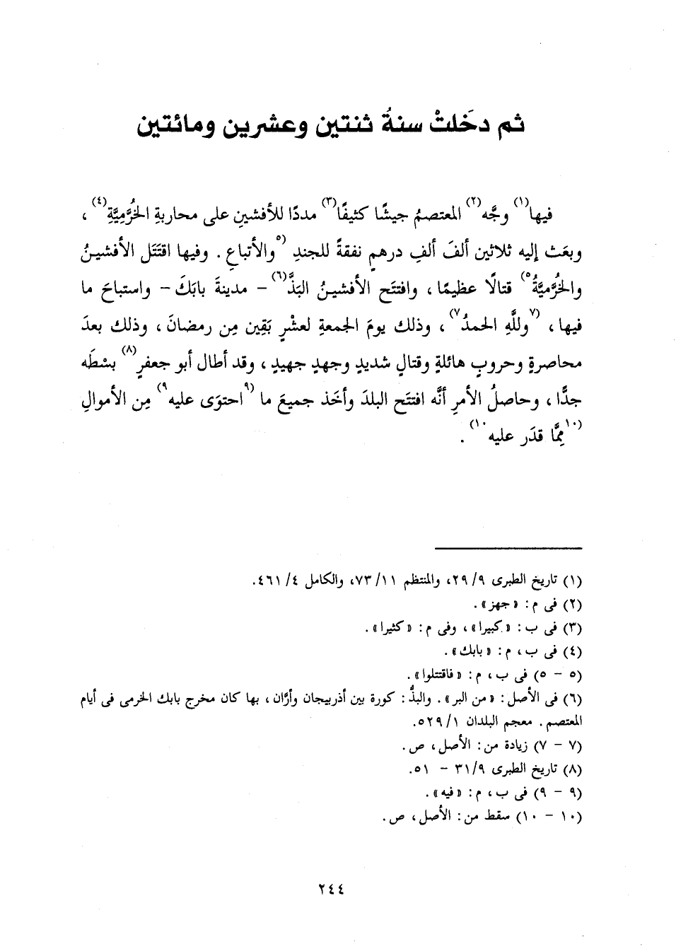 فِيهَا وَجَّهَ الْمُعْتَصِمُ جَيْشًا كَثِيفًا مَدَدًا لِلْأَفْشِينِ عَلَى مُحَارَبَةِ الْخُرَّمِيَّةِ، وَبَعَثَ إِلَيْهِ ثَلَاثِينَ أَلْفَ أَلْفِ دِرْهَمٍ نَفَقَةً لِلْجُنْدِ وَالْأَتْبَاعِ. وَفِيهَا اقْتَتَلَ الْأَفْشِينُ والْخُرَّمِيَّةُ قِتَالًا عَظِيمًا، وَافْتَتَحَ الْأَفْشِينُ الْبَذَّ مَدِينَةَ بَابَكَ وَاسْتَبَاحَ مَا فِيهَا، وَلِلَّهِ الْحَمْدُ، وَذَلِكَ يَوْمَ الْجُمُعَةِ لِعَشْرٍ بَقِينَ مِنْ رَمَضَانَ، وَذَلِكَ بَعْدَ مُحَاصَرَةٍ وَحُرُوبٍ هَائِلَةٍ وَقِتَالٍ شَدِيدٍ وَجُهْدٍ جَهِيدٍ، وَقَدْ أَطَالَ أَبُو جَعْفَرٍ بَسْطَهُ جِدًّا. وَحَاصِلُ الْأَمْرِ أَنَّهُ افْتَتَحَ الْبَلَدَ وَأَخَذَ جَمِيعَ مَا احْتَوَى عَلَيْهِ مِنَ الْأَمْوَالِ مِمَّا قَدَرَ عَلَيْهِ.