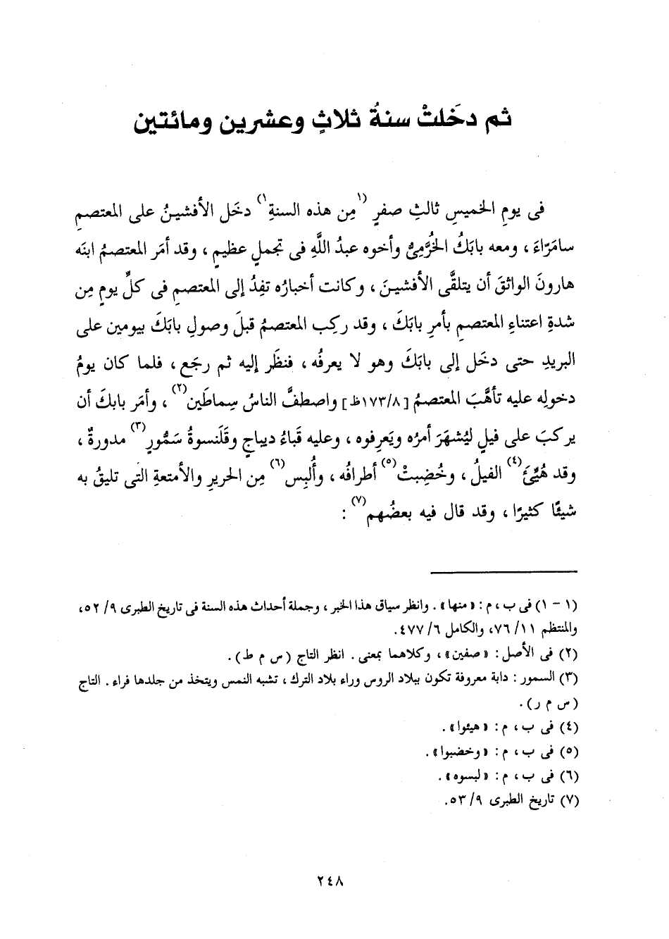 فِي يَوْمِ الْخَمِيسِ ثَالِثِ صَفَرٍ مِنْ هَذِهِ السَّنَةِ دَخَلَ الْأَفْشِينُ عَلَى الْمُعْتَصِمِ سَامَرَّاءَ وَمَعَهُ بَابَكُ الْخُرَّمِيُّ وَأَخُوهُ عَبْدُ اللَّهِ فِي تَجَمُّلٍ عَظِيمٍ، وَقَدْ أَمَرَ الْمُعْتَصِمُ ابْنَهُ هَارُونَ الْوَاثِقَ أَنْ يَتَلَقَّى الْأَفْشِينَ وَكَانَتْ أَخْبَارُهُ تَفِدُ إِلَى الْمُعْتَصِمِ فِي كُلِّ يَوْمٍ مِنْ شِدَّةِ اعْتِنَاءِ الْمُعْتَصِمِ بِأَمْرِ بَابَكَ، وَقَدْ رَكِبَ الْمُعْتَصِمُ قَبْلَ وُصُولِ بَابَكَ بِيَوْمَيْنِ عَلَى الْبَرِيدِ حَتَّى دَخَلَ إِلَى بَابَكَ وَهُوَ لَا يَعْرِفُهُ، فَنَظَرَ إِلَيْهِ ثُمَّ رَجَعَ، فَلَمَّا كَانَ يَوْمُ دُخُولِهِ عَلَيْهِ تَأَهَّبَ الْمُعْتَصِمُ وَاصْطَفَّ النَّاسُ سِمَاطَيْنِ، وَأَمَرَ بَابَكَ أَنْ يَرْكَبَ عَلَى فِيلٍ لِيَشْتَهِرَ أَمْرُهُ وَيَعْرِفُوهُ، وَعَلَيْهِ قَبَاءُ دِيبَاجٍ وَقَلَنْسُوَةُ سَمُّورٍ مُدَوَّرَةٌ، وَقَدْ هُيِّئَ الْفِيلُ، وَخُضِّبَتْ أَطْرَافُهُ، وَأُلْبِسَ مِنَ الْحَرِيرِ وَالْأَمْتِعَةِ الَّتِي تَلِيقُ بِهِ كَثِيرًا، وَقَدْ قَالَ فِيهِ بَعْضُهُمْ: