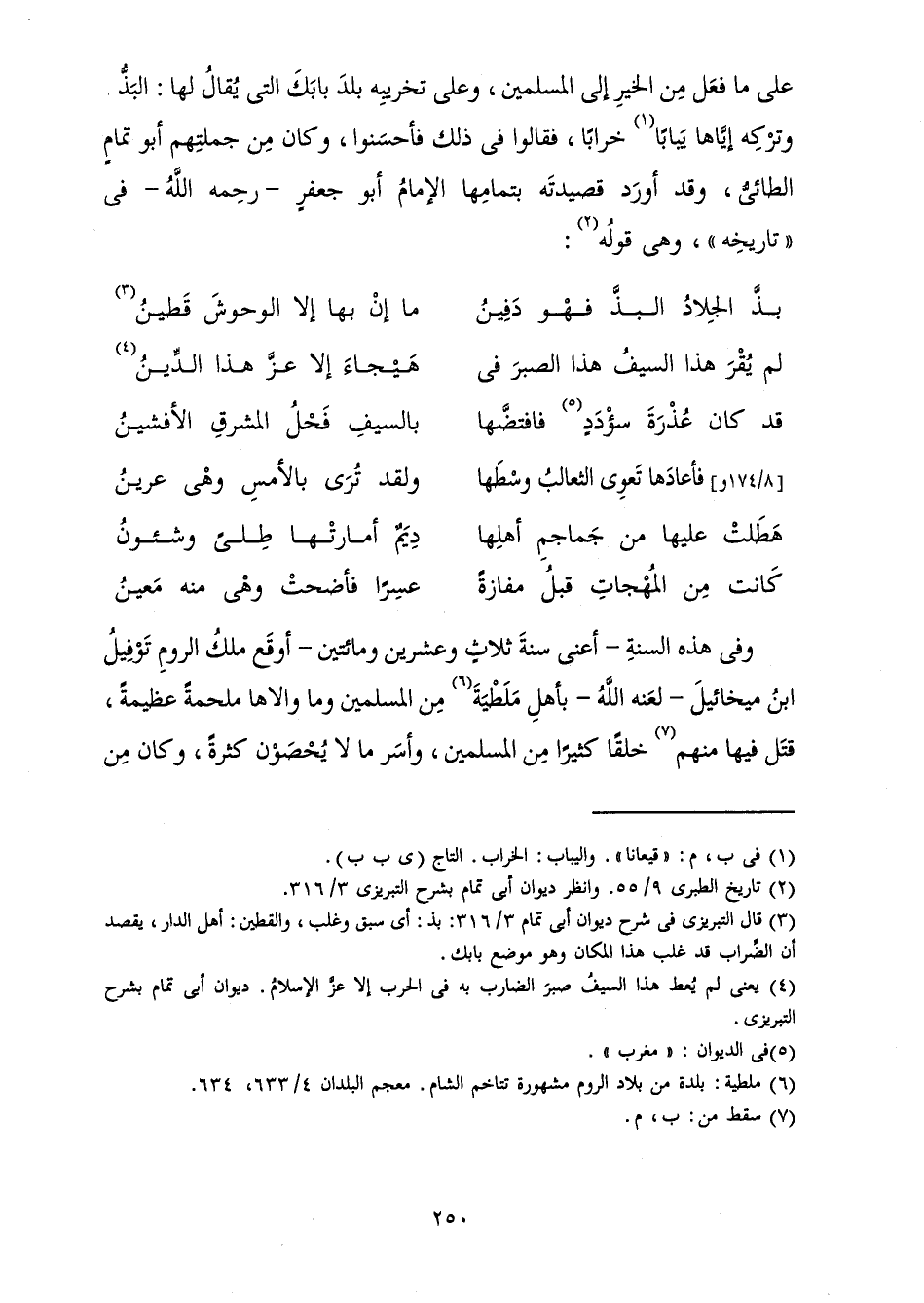 عَلَى مَا فَعَلَ مِنَ الْخَيْرِ إِلَى الْمُسْلِمِينَ، وَعَلَى تَخْرِيبِهِ بَلَدَ بَابَكَ الَّتِي يُقَالُ لَهَا الْبَذُّ وَتَرْكِهِ إِيَّاهَا يَبَابًا خَرَابًا، فَقَالُوا فِي ذَلِكَ فَأَحْسَنُوا، وَكَانَ مِنْ جُمْلَتِهِمْ أَبُو تَمَامٍ الطَّائِيُّ، وَقَدْ أَوْرَدَ قَصِيدَتَهُ بِتَمَامِهَا الْإِمَامُ أَبُو جَعْفَرٍ رَحِمَهُ اللَّهُ فِي " " تَارِيخِهِ " "، وَهِيَ قَوْلُهُ: