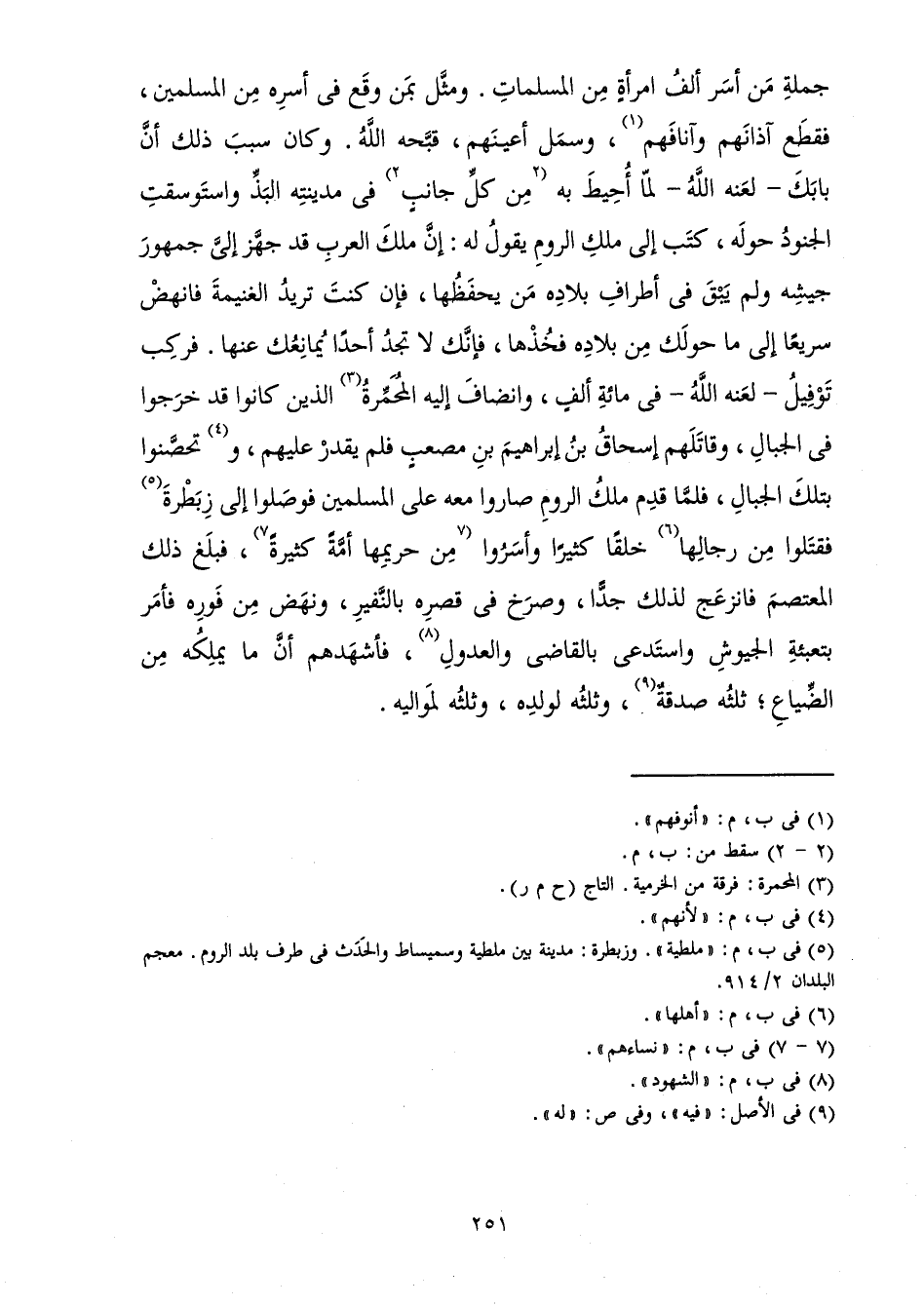 جُمْلَةِ مَنْ أَسَرَ أَلْفَ امْرَأَةٍ مِنَ الْمُسْلِمَاتِ، وَمَثَّلَ بِمَنْ وَقَعَ فِي أَسْرِهِ مِنَ الْمُسْلِمِينَ فَقَطَّعَ آذَانَهُمْ وَآنَافَهُمْ وَسَمَلَ أَعْيُنَهُمْ، قَبَّحَهُ اللَّهُ. وَكَانَ سَبَبَ ذَلِكَ أَنَّ بَابَكَ لَعَنَهُ اللَّهُ لَمَّا أُحِيطَ بِهِ مِنْ كُلِّ جَانِبٍ فِي مَدِينَتِهِ الْبَذِّ وَاسْتَوْسَقَتِ الْجُنُودُ حَوْلَهُ، كَتَبَ إِلَى مَلِكِ الرُّومِ يَقُولُ لَهُ: إِنَّ مِلْكَ الْعَرَبِ قَدْ جَهَّزَ إِلَيَّ جُمْهُورَ جَيْشِهِ وَلَمْ يُبْقِ فِي أَطْرَافِ بِلَادِهِ مَنْ يَحْفَظُهَا، فَإِنْ كُنْتَ تُرِيدُ الْغَنِيمَةَ فَانْهَضْ سَرِيعًا إِلَى مَا حَوْلَكَ مِنْ بِلَادِهِ فَخُذْهَا، فَإِنَّكَ لَا تَجِدُ أَحَدًا يُمَانِعُكَ عَنْهَا، فَرَكِبَ تَوْفِيلُ - لَعَنَهُ اللَّهُ - فِي مِائَةِ أَلْفٍ، وَانْضَافَ إِلَيْهِ الْمُحَمِّرَةُ الَّذِينَ كَانُوا قَدْ خَرَجُوا فِي الْجِبَالِ وَقَاتَلَهُمْ إِسْحَاقُ بْنُ إِبْرَاهِيمَ بْنِ مُصْعَبٍ فَلَمْ يَقْدِرْ عَلَيْهِمْ، وَتَحَصَّنُوا بِتِلْكَ الْجِبَالِ فَلَمَّا قَدِمَ مَلِكُ الرُّومِ صَارُوا مَعَهُ عَلَى الْمُسْلِمِينَ، فَوَصَلُوا إِلَى زِبَطْرَةَ فَقَتَلُوا مِنْ رِجَالِهَا خَلْقًا كَثِيرًا وَأَسَرُوا مِنْ حَرِيمِهَا أُمَّةً كَثِيرَةً، فَبَلَغَ ذَلِكَ الْمُعْتَصِمَ فَانْزَعَجَ لِذَلِكَ جِدًّا، وَصَرَخَ فِي قَصْرِهِ بِالنَّفِيرِ، وَنَهَضَ مِنْ فَوْرِهِ، فَأَمَرَ بِتَعْبِئَةِ الْجُيُوشِ، وَاسْتَدْعَى بِالْقَاضِي، وَالْعُدُولِ، فَأَشْهَدَهُمْ أَنَّ مَا يَمْلِكُهُ مِنَ الضِّيَاعِ ثُلُثُهُ صَدَقَةٌ، وَثُلُثُهُ لِوَلَدِهِ، وَثُلُثُهُ لِمَوَالِيهِ.