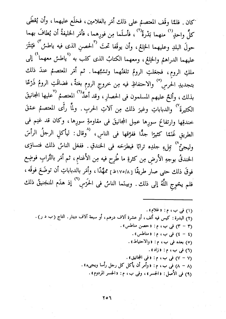 كَانَ. فَلَمَّا وَقَفَ الْمُعْتَصِمُ عَلَى ذَلِكَ أَمَرَ بِالْغُلَامَيْنِ، فَخَلَعَ عَلَيْهِمَا، وَأَنْ يُعْطَى كُلُّ وَاحِدٍ مِنْهُمَا بِدُرَّةٍ، فَأَسْلَمَا مِنْ فَوْرِهِمَا، فَأَمَرَ الْخَلِيفَةُ أَنْ يُطَافَ بِهِمَا حَوْلَ الْبَلَدِ، وَعَلَيْهِمَا الْخُلَعُ، وَأَنْ يُوقَفَا تَحْتَ الْحِصْنِ الَّذِي فِيهِ يَاطَسُ، فَيُنْثَرَ عَلَيْهِمَا الدَّرَاهِمُ وَالْخُلَعُ، وَمَعَهُمَا الْكِتَابُ الَّذِي كَتَبَ بِهِ يَاطَسُ مَعَهُمَا إِلَى مَلِكِ الرُّومِ، فَجَعَلَتْ الرُّومُ تَلْعَنُهُمَا وَتَسُبُّهُمَا. ثُمَّ أَمَرَ الْمُعْتَصِمُ عِنْدَ ذَلِكَ بِتَجْدِيدِ الْحَرَسِ وَالِاحْتِفَاظِ فِيهِ مِنْ خُرُوجِ الرُّومِ بَغْتَةً، فَضَاقَتْ الرُّومُ ذَرْعًا بِذَلِكَ، وَأَلَحَّ عَلَيْهِمُ الْمُسْلِمُونَ فِي الْحِصَارِ، وَقَدْ أَعَدَّ الْمُعْتَصِمُ عَلَيْهَا الْمَجَانِيقَ الْكَثِيرَةَ وَالدَّبَّابَاتِ وَغَيْرَ ذَلِكَ مِنْ آلَاتِ الْحَرْبِ. وَلَمَّا رَأَى الْمُعْتَصِمُ عُمْقَ خَنْدَقِهَا، وَارْتِفَاعَ سُورِهَا عَمِلَ الْمَجَانِيقَ فِي مُقَاوَمَةِ سُورِهَا، وَكَانَ قَدْ غَنِمَ فِي الطَّرِيقِ غَنَمًا كَثِيرًا جِدًّا فَفَرَّقَهَا فِي النَّاسِ، وَقَالَ: لِيَأْكُلِ الرَّجُلُ الرَّأْسَ، وَلْيَجِىءْ بِمِلْءِ جِلْدِهِ تُرَابًا فَيَطْرَحُهُ فِي الْخَنْدَقِ. فَفَعَلَ النَّاسُ ذَلِكَ، فَتَسَاوَى الْخَنْدَقُ بِوَجْهِ الْأَرْضِ مِنْ كَثْرَةِ مَا طُرِحَ فِيهِ مِنَ الْأَغْنَامِ، ثُمَّ أَمَرَ بِالتُّرَابِ، فَوُضِعَ فَوْقَ ذَلِكَ حَتَّى صَارَ طَرِيقًا مُمَهَّدًا، وَأَمَرَ بِالدَّبَّابَاتِ أَنْ تُوضَعَ فَوْقَهُ، فَلَمْ يُحْوِجِ اللَّهُ إِلَى ذَلِكَ، وَبَيْنَمَا النَّاسُ فِي الْحَرَسِ إِذْ هَدَمَ الْمَنْجَنِيقُ ذَلِكَ