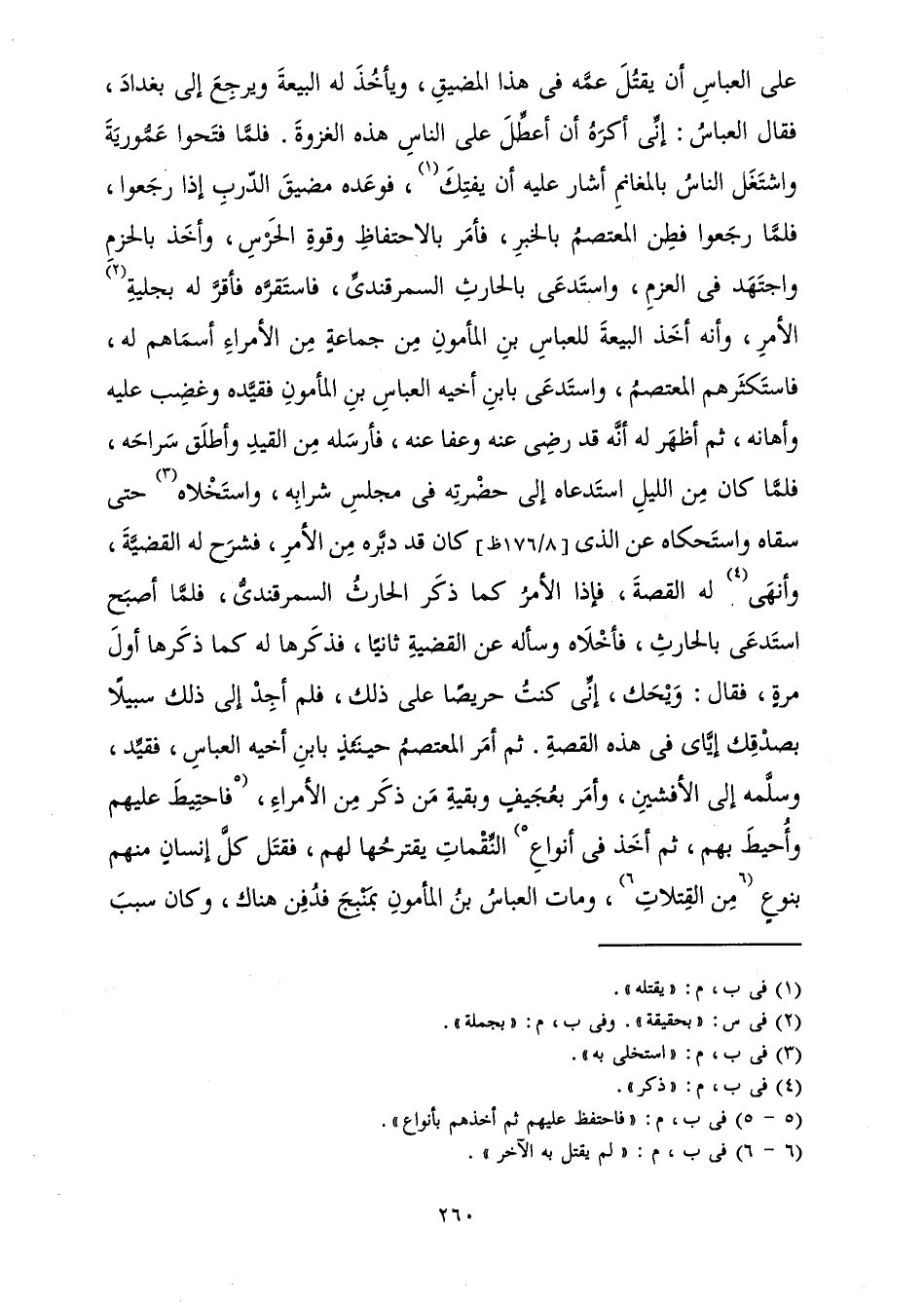عَلَى الْعَبَّاسِ أَنْ يَقْتُلَ عَمَّهُ فِي هَذَا الْمَضِيقِ، وَيَأْخُذَ لَهُ الْبَيْعَةَ، وَيَرْجِعَ إِلَى بَغْدَادَ فَقَالَ الْعَبَّاسُ: إِنِّي أَكْرَهُ أَنْ أُعَطِّلَ عَلَى النَّاسِ هَذِهِ الْغَزْوَةَ. فَلَمَّا فَتَحُوا عَمُّورِيَةَ وَاشْتَغَلَ النَّاسُ بِالْمَغَانِمِ أَشَارَ عَلَيْهِ أَنْ يَفْتِكَ، فَوَعَدَهُ مَضِيقَ الدَّرْبِ إِذَا رَجَعُوا، فَلَمَّا رَجَعُوا فَطِنَ الْمُعْتَصِمُ بِالْخَبَرِ، فَأَمَرَ بِالِاحْتِفَاظِ وَقُوَّةِ الْحَرَسِ، وَأَخَذَ بِالْحَزْمِ وَاجْتَهَدَ فِي الْعَزْمِ، وَاسْتَدْعَى بِالْحَارِثِ السَّمَرْقَنْدِيِّ، فَاسْتَقَرَّهُ فَأَقَرَّ لَهُ بِجَلِيَّةِ الْأَمْرِ، وَأَنَّهُ أَخَذَ الْبَيْعَةَ لِلْعَبَّاسِ بْنِ الْمَأْمُونِ مِنْ جَمَاعَةٍ مِنَ الْأُمَرَاءِ أَسْمَاهُمْ لَهُ، فَاسْتَكْثَرَهُمُ الْمُعْتَصِمُ، وَاسْتَدْعَى بِابْنِ أَخِيهِ الْعَبَّاسِ بْنِ الْمَأْمُونِ فَقَيَّدَهُ وَغَضِبَ عَلَيْهِ وَأَهَانَهُ، ثُمَّ أَظْهَرَ لَهُ أَنَّهُ قَدْ رَضِيَ عَنْهُ وَعَفَا عَنْهُ، فَأَرْسَلَهُ مِنَ الْقَيْدِ وَأَطْلَقَ سَرَاحَهُ، فَلَمَّا كَانَ مِنَ اللَّيْلِ اسْتَدْعَاهُ إِلَى حَضْرَتِهِ فِي مَجْلِسِ شَرَابِهِ، وَاسْتَخْلَاهُ حَتَّى سَقَاهُ وَاسْتَحْكَاهُ عَنِ الَّذِي كَانَ قَدْ دَبَّرَهُ مِنَ الْأَمْرِ، فَشَرَحَ لَهُ الْقَضِيَّةَ وَأَنْهَى لَهُ الْقِصَّةَ، فَإِذَا الْأَمْرُ كَمَا ذَكَرَ الْحَارِثُ السَّمَرْقَنْدِيُّ، فَلَمَّا أَصْبَحَ اسْتَدْعَى بِالْحَارِثِ، فَأَخْلَاهُ وَسَأَلَهُ عَنِ الْقَضِيَّةِ ثَانِيًا، فَذَكَرَهَا لَهُ كَمَا ذَكَرَهَا أَوَّلَ مَرَّةٍ، فَقَالَ: وَيْحَكَ، إِنِّي كُنْتُ حَرِيصًا عَلَى ذَلِكَ، فَلَمْ أَجِدْ إِلَى ذَلِكَ سَبِيلًا بِصِدْقِكَ إِيَّايَ فِي هَذِهِ الْقِصَّةِ. ثُمَّ أَمَرَ الْمُعْتَصِمُ حِينَئِذٍ بِابْنِ أَخِيهِ الْعَبَّاسِ، فَقُيِّدَ وَسَلَّمَهُ إِلَى الْأَفْشِينِ وَأَمَرَ بِعُجَيْفٍ وَبَقِيَّةِ مَنْ ذَكَرَ مِنَ الْأُمَرَاءِ، فَاحْتِيطَ عَلَيْهِمْ وَأُحِيطَ بِهِمْ، ثُمَّ أَخَذَ فِي أَنْوَاعِ النِّقْمَاتِ يَقْتَرِحُهَا لَهُمْ، فَقَتَلَ كُلَّ إِنْسَانٍ مِنْهُمْ بِنَوْعٍ مِنَ الْقِتْلَاتِ، وَمَاتَ الْعَبَّاسُ بْنُ الْمَأْمُونِ بِمَنْبِجَ فَدُفِنَ هُنَاكَ، وَكَانَ سَبَبَ