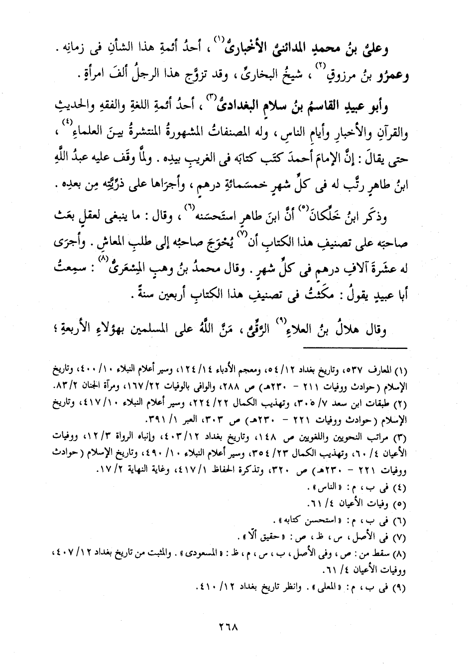 وَأَبُو عُبَيْدٍ الْقَاسِمُ بْنُ سَلَامٍ الْبَغْدَادِيُّ، أَحَدُ أَئِمَّةِ اللُّغَةِ وَالْفِقْهِ وَالْحَدِيثِ وَالْقُرْآنِ وَالْأَخْبَارِ وَأَيَّامِ النَّاسِ، وَلَهُ الْمُصَنَّفَاتُ الْمَشْهُورَةُ الْمُنْتَشِرَةُ بَيْنَ الْعُلَمَاءِ، حَتَّى يُقَالَ: إِنَّ الْإِمَامَ أَحْمَدَ كَتَبَ كِتَابَهُ فِي الْغَرِيبِ بِيَدِهِ. وَلَمَّا وَقَفَ عَلَيْهِ عَبْدُ اللَّهِ بْنُ طَاهِرٍ رَتَّبَ لَهُ فِي كُلِّ شَهْرٍ خَمْسَمِائَةِ دِرْهَمٍ، وَأَجْرَاهَا عَلَى ذُرِّيَّتِهِ مِنْ بَعْدِهِ.