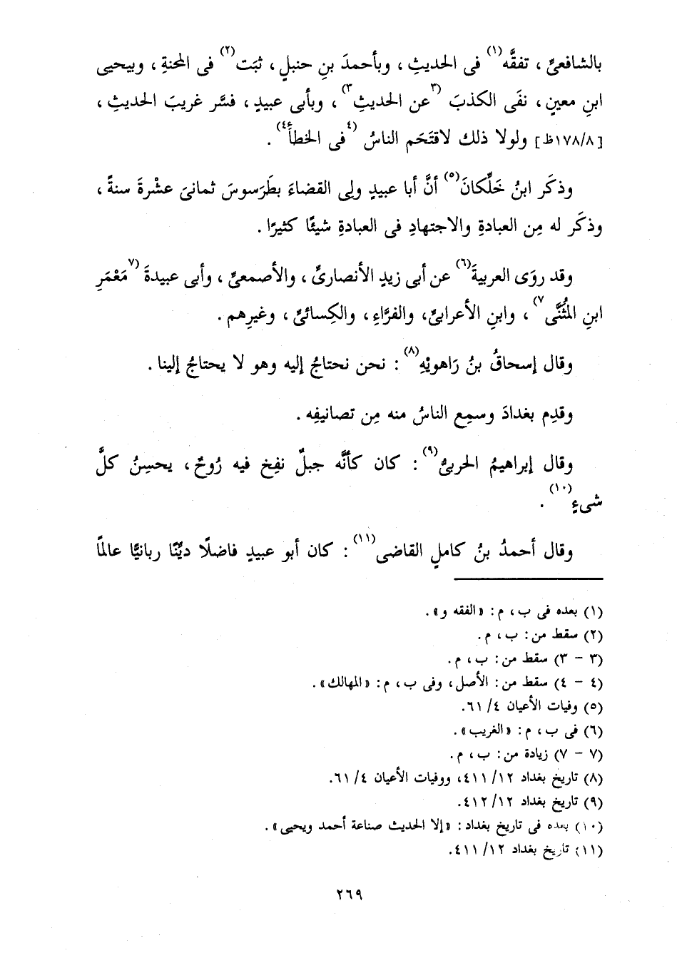 بِالشَّافِعِيِّ تَفَقَّهَ فِي الْحَدِيثِ، وَبِأَحْمَدَ بْنِ حَنْبَلٍ ثَبَتَ فِي الْمِحْنَةِ، وَبِيَحْيَى بْنِ مَعِينٍ نَفَى الْكَذِبَ عَنِ الْحَدِيثِ، وَبِأَبِي عُبَيْدٍ، فَسَّرَ غَرِيبَ الْحَدِيثِ، وَلَوْلَا ذَلِكَ لَاقْتَحَمَ النَّاسُ فِي الْخَطَأِ.