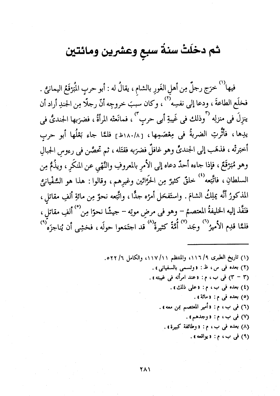 ثُمَّ دَخَلَتْ سَنَةُ سَبْعٍ وَعِشْرِينَ وَمِائَتَيْنِ