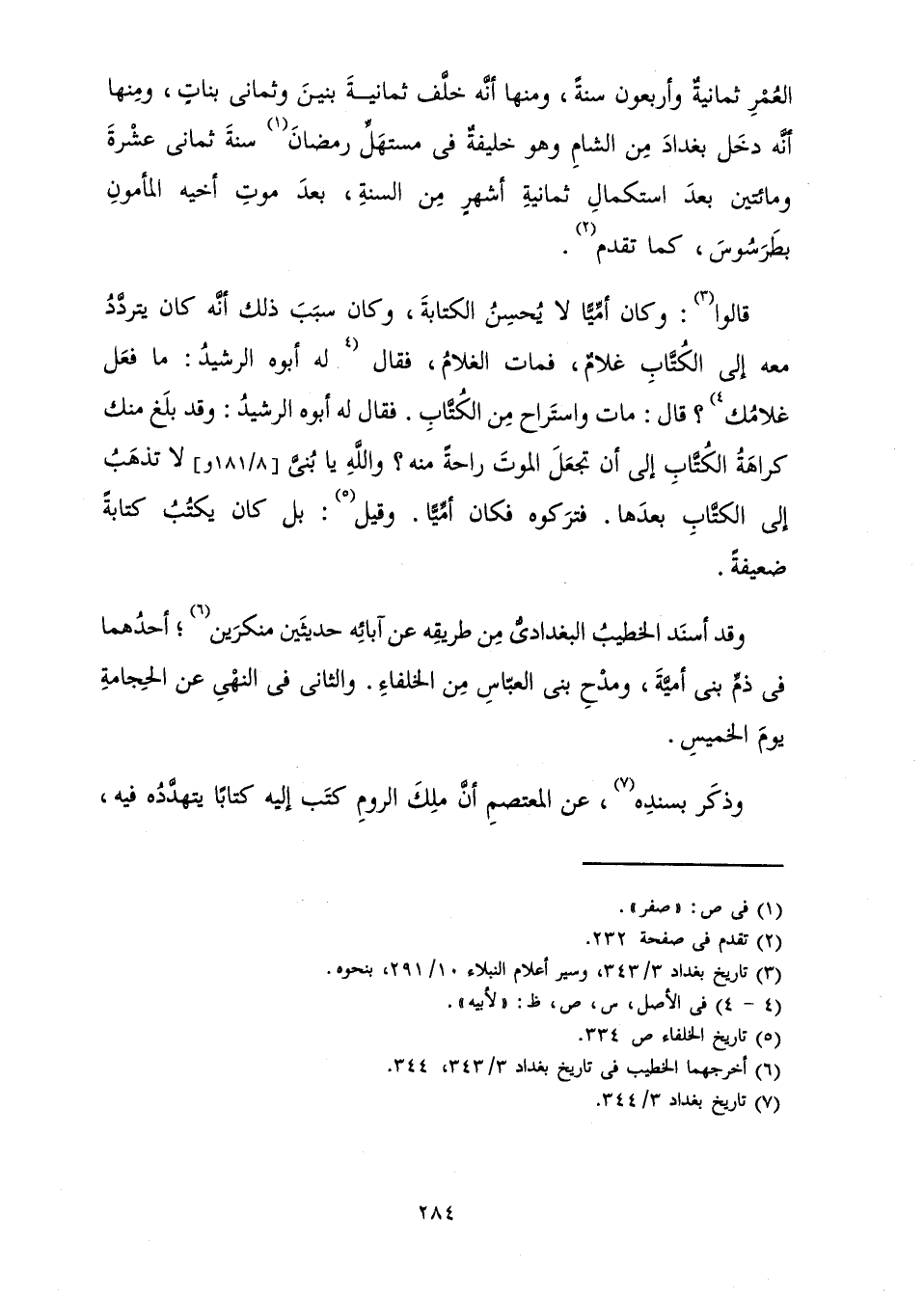 قَالُوا: وَكَانَ أُمِّيًّا لَا يُحْسِنُ الْكِتَابَةَ، وَكَانَ سَبَبَ ذَلِكَ أَنَّهُ كَانَ يَتَرَدَّدُ مَعَهُ إِلَى الْكُتَّابِ غُلَامٌ، فَمَاتَ الْغُلَامُ، فَقَالَ لَهُ أَبُوهُ الرَّشِيدُ: مَا فَعَلَ غُلَامُكَ؟ قَالَ: مَاتَ وَاسْتَرَاحَ مِنَ الْكُتَّابِ. فَقَالَ لَهُ أَبُوهُ الرَّشِيدُ: وَقَدْ بَلَغَ مِنْكَ كَرَاهَةُ الْكُتَّابِ إِلَى أَنْ تَجْعَلَ الْمَوْتَ رَاحَةً مِنْهُ؟ وَاللَّهِ يَا بُنَيَّ لَا تَذْهَبُ إِلَى الْكُتَّابِ بَعْدَهَا. فَتَرَكُوهُ فَكَانَ أُمِّيًّا، وَقِيلَ: بَلْ كَانَ يَكْتُبُ كِتَابَةً ضَعِيفَةً.
