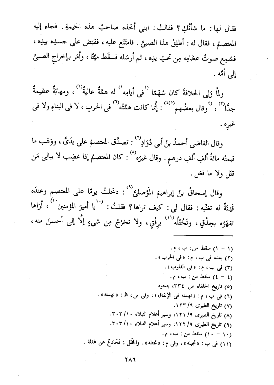 فَقَالَ لَهَا: مَا شَأْنُكِ؟ فَقَالَتْ: ابْنِي أَخَذَهُ صَاحِبُ هَذِهِ الْخَيْمَةِ. فَجَاءَ إِلَيْهِ الْمُعْتَصِمُ، فَقَالَ لَهُ: أَطْلِقْ هَذَا الصَّبِيَّ. فَامْتَنَعَ عَلَيْهِ، فَقَبَضَ عَلَى جَسَدِهِ بِيَدِهِ، فَسُمِعَ صَوْتُ عِظَامِهِ مِنْ تَحْتِ يَدِهِ، ثُمَّ أَرْسَلَهُ فَسَقَطَ مَيِّتًا، وَأَمَرَ بِإِخْرَاجِ الصَّبِيِّ إِلَى أُمِّهِ
