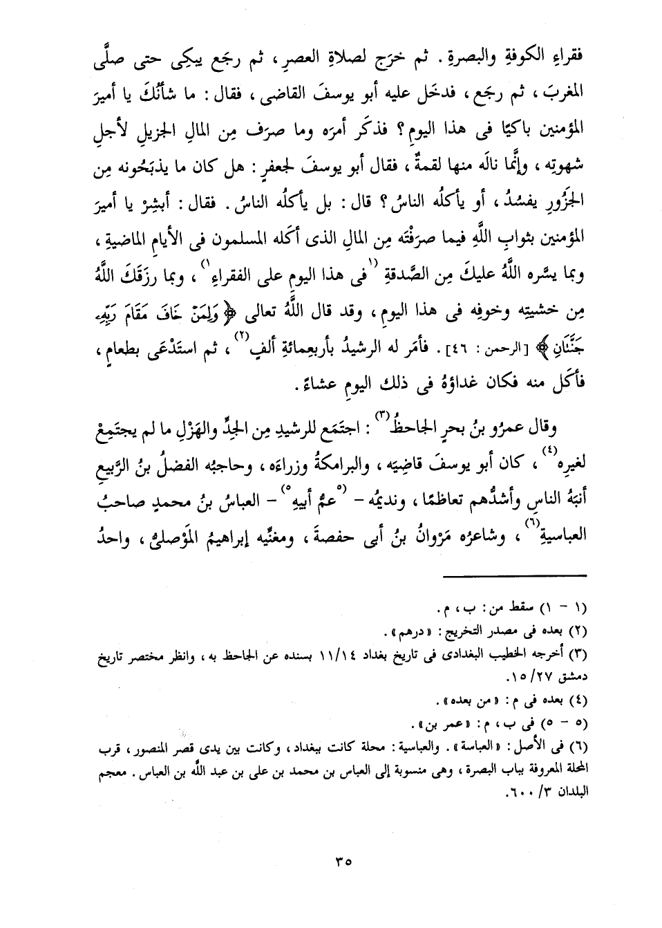 فَقُرَاءِ الْكُوفَةِ وَالْبَصْرَةِ. ثُمَّ خَرَجَ لِصَلَاةِ الْعَصْرِ، ثُمَّ رَجَعَ يَبْكِي حَتَّى صَلَّى الْمَغْرِبَ، ثُمَّ رَجَعَ، فَدَخَلَ عَلَيْهِ أَبُو يُوسُفَ الْقَاضِي، فَقَالَ: مَا شَأْنُكَ يَا أَمِيرَ الْمُؤْمِنِينَ بَاكِيًا فِي هَذَا الْيَوْمِ؟ فَذَكَرَ أَمْرَهُ، وَمَا صَرَفَ مِنَ الْمَالِ الْجَزِيلِ لِأَجْلِ شَهْوَتِهِ، وَإِنَّمَا نَالَهُ مِنْهَا لُقْمَةٌ، فَقَالَ أَبُو يُوسُفَ لِجَعْفَرٍ: هَلْ كَانَ مَا يَذْبَحُونَهُ مِنَ الْجَزُورِ يَفْسَدُ، أَوْ يَأْكُلُهُ النَّاسُ؟ قَالَ: بَلْ يَأْكُلُهُ النَّاسُ. فَقَالَ: أَبْشِرْ يَا أَمِيرَ الْمُؤْمِنِينَ بِثَوَابِ اللَّهِ فِيمَا صَرَفْتَهُ مِنَ الْمَالِ الَّذِي أَكَلَهُ الْمُسْلِمُونَ فِي الْأَيَّامِ الْمَاضِيَةِ، وَبِمَا يَسَّرَهُ اللَّهُ عَلَيْكَ مِنَ الصَّدَقَةِ فِي هَذَا الْيَوْمِ عَلَى الْفُقَرَاءِ، وَبِمَا رَزَقَكَ اللَّهُ مِنْ خَشْيَتِهِ وَخَوْفِهِ فِي هَذَا الْيَوْمِ، وَقَدْ قَالَ اللَّهُ تَعَالَى {وَلِمَنْ خَافَ مَقَامَ رَبِّهِ جَنَّتَانِ} [الرحمن: 46] فَأَمَرَ لَهُ الرَّشِيدُ بِأَرْبَعِمِائَةِ أَلْفٍ، ثُمَّ اسْتَدْعَى بِطَعَامٍ، فَأَكَلَ مِنْهُ فَكَانَ غَدَاؤُهُ فِي ذَلِكَ الْيَوْمِ عَشَاءً.