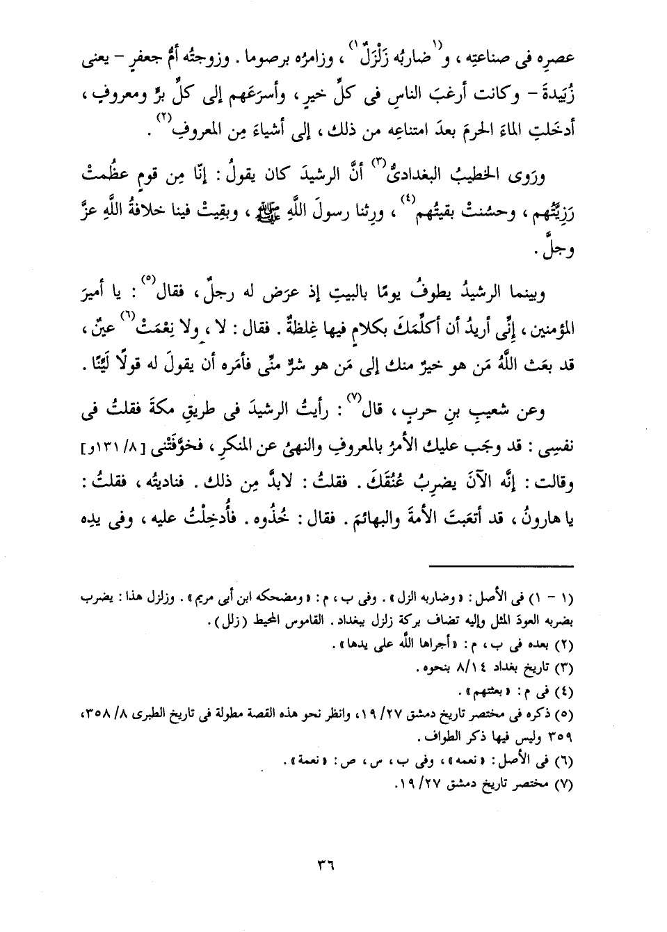عَصْرِهِ فِي صِنَاعَتِهِ وَضَارِبُهُ زَلْزَلٌ، وَزَامِرُهُ بَرْصُومَا، وَزَوْجَتُهُ أُمُّ جَعْفَرٍ يَعْنِي زُبَيْدَةَ، وَكَانَتْ أَرْغَبَ النَّاسِ فِي كُلِّ خَيْرٍ، وَأَسْرَعَهُمْ إِلَى كُلِّ بِرٍّ وَمَعْرُوفٍ، أَدْخَلَتِ الْمَاءَ الْحَرَمَ بَعْدَ امْتِنَاعِهِ مِنْ ذَلِكَ، إِلَى أَشْيَاءَ مِنَ الْمَعْرُوفِ.