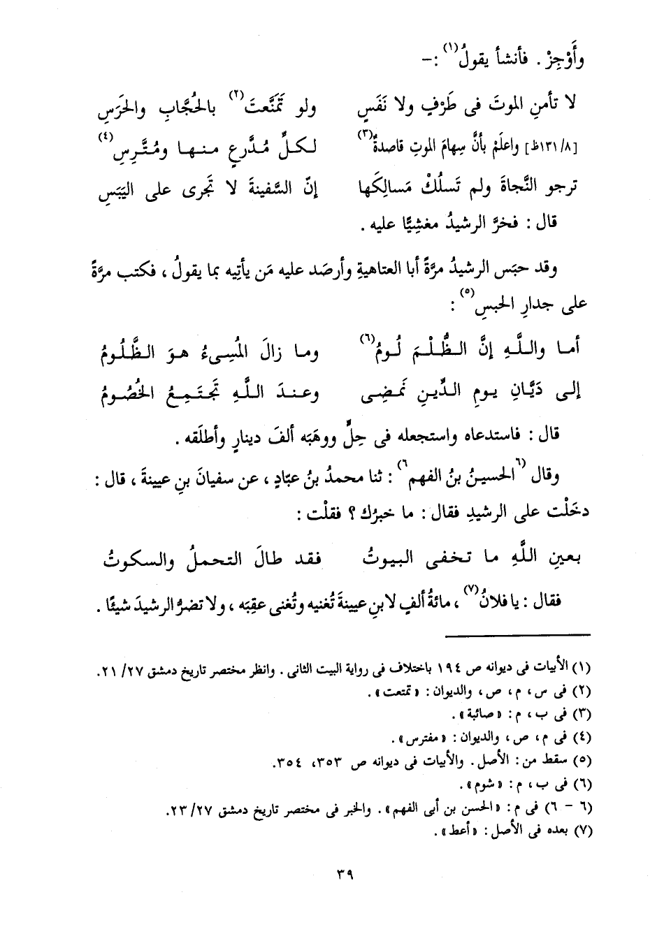 وَقَدْ حَبَسَ الرَّشِيدُ مَرَّةً أَبَا الْعَتَاهِيَةِ، وَأَرْصَدَ عَلَيْهِ مَنْ يَأْتِيهِ بِمَا يَقُولُ، فَكَتَبَ مَرَّةً عَلَى جِدَارِ الْحَبْسِ: