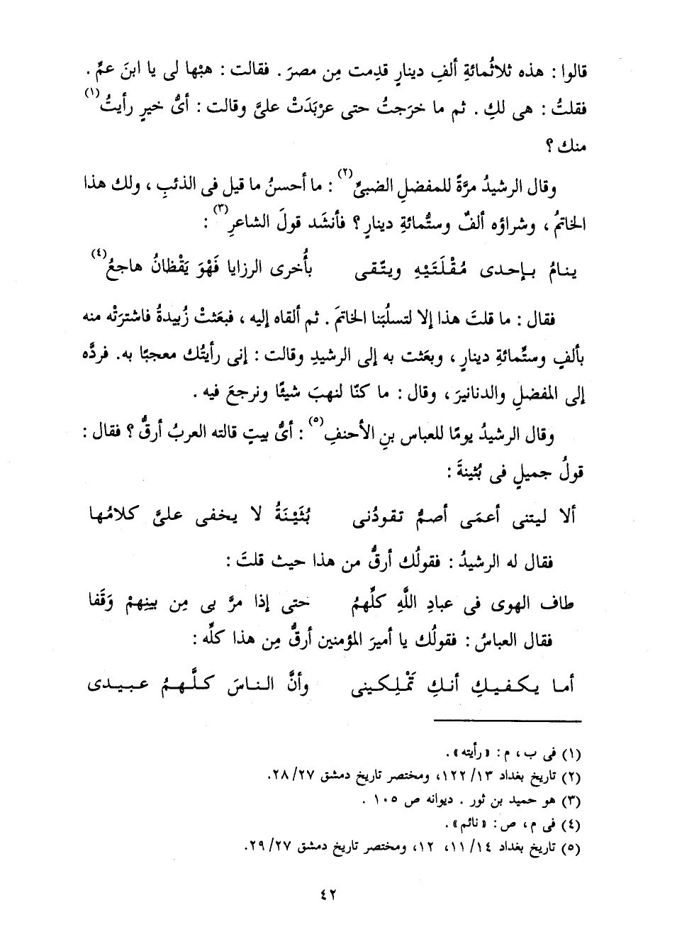 وَقَالَ الرَّشِيدُ يَوْمًا لِلْعَبَّاسِ بْنِ الْأَحْنَفِ: أَيُّ بَيْتٍ قَالَتْهُ الْعَرَبُ أَرَقُّ؟ فَقَالَ: قَوْلُ جَمِيلٍ فِي بُثَيْنَةَ: