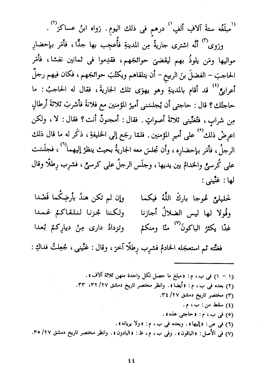 فَغَنَّتْهُ ثُمَّ اسْتَعْجَلَهُ الْخَادِمُ فَشَرِبَ رِطْلًا آخَرَ، وَقَالَ: غَنِّينِي، جُعِلْتُ فِدَاكِ: