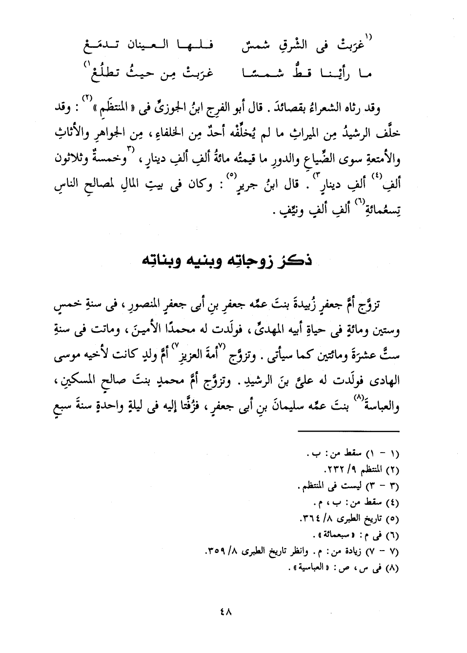 وَقَدْ رَثَاهُ الشُّعَرَاءُ بِقَصَائِدَ. قَالَ أَبُو الْفَرَجِ ابْنُ الْجَوْزِيِّ فِي " " الْمُنْتَظَمِ " ": وَقَدْ خَلَّفَ الرَّشِيدُ مِنَ الْمِيرَاثِ مَا لَمْ يُخَلِّفْهُ أَحَدٌ مِنَ الْخُلَفَاءِ، مِنَ الْجَوَاهِرِ، وَالْأَثَاثِ، وَالْأَمْتِعَةِ سِوَى الضِّيَاعِ، وَالدُّورِ مَا قِيمَتُهُ مِائَةُ أَلْفِ أَلْفِ دِينَارٍ، وَخَمْسَةٌ وَثَلَاثُونَ أَلْفَ أَلْفِ دِينَارٍ. قَالَ ابْنُ جَرِيرٍ وَكَانَ فِي بَيْتِ الْمَالِ لِمَصَالِحِ النَّاسِ تِسْعُمِائَةِ أَلْفِ أَلْفٍ، وَنَيِّفٍ.