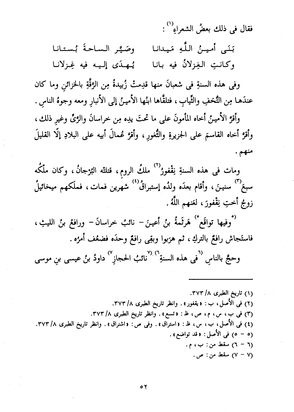 وَمَاتَ فِي هَذِهِ السَّنَةِ نِقْفُورُ مَلِكُ الرُّومِ، قَتَلَهُ الْبُرْجَانُ، وَكَانَ مُلْكُهُ سَبْعَ سِنِينَ، وَأَقَامَ بَعْدَهُ وَلَدُهُ إِسْتِبْرَاقُ شَهْرَيْنِ فَمَاتَ، فَمَلَكَهُمْ مِيخَائِيلُ زَوْجُ أُخْتِ نِقْفُورَ لَعَنَهُمُ اللَّهُ.