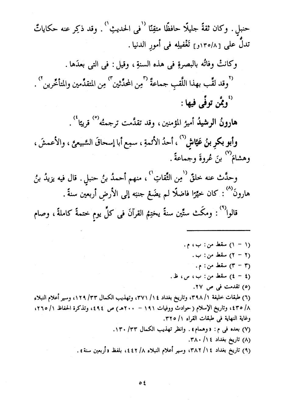 حَنْبَلٍ. وَكَانَ ثِقَةً جَلِيلًا حَافِظًا مُتْقِنًا فِي الْحَدِيثِ. وَقَدْ ذُكِرَ عَنْهُ حِكَايَاتٌ تَدُلُّ عَلَى تَغْفِيلِهِ فِي أُمُورِ الدُّنْيَا.