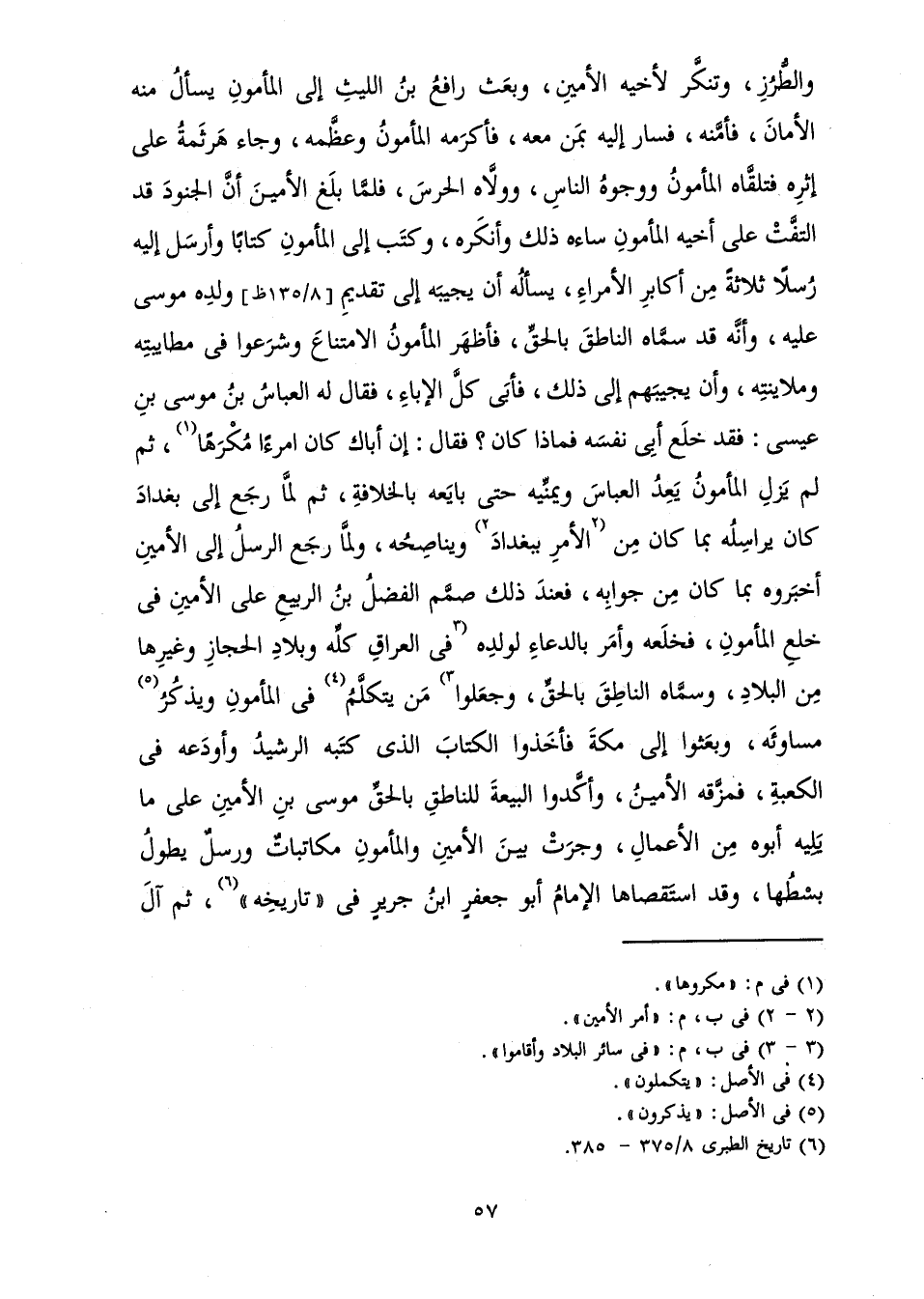 وَالطُّرُزِ، وَتَنَكَّرَ لِأَخِيهِ الْأَمِينِ، وَبَعَثَ رَافِعُ بْنُ اللَّيْثِ إِلَى الْمَأْمُونِ يَسْأَلُ مِنْهُ الْأَمَانَ فَأَمَّنَهُ، فَسَارَ إِلَيْهِ بِمَنْ مَعَهُ، فَأَكْرَمَهُ الْمَأْمُونُ وَعَظَّمَهُ، وَجَاءَ هَرْثَمَةُ عَلَى إِثْرِهِ فَتَلَقَّاهُ الْمَأْمُونُ وَوُجُوهُ النَّاسِ، وَوَلَّاهُ الْحَرَسَ، فَلَمَّا بَلَغَ الْأَمِينَ أَنَّ الْجُنُودَ قَدِ الْتَفَّتَ عَلَى أَخِيهِ الْمَأْمُونِ سَاءَهُ ذَلِكَ وَأَنْكَرَهُ، وَكَتَبَ إِلَى الْمَأْمُونِ كِتَابًا وَأَرْسَلَ إِلَيْهِ رُسُلًا ثَلَاثَةً مِنْ أَكَابِرِ الْأُمَرَاءِ، يَسْأَلُهُ أَنْ يُجِيبَهُ إِلَى تَقْدِيمِ وَلَدِهِ مُوسَى عَلَيْهِ، وَأَنَّهُ قَدْ سَمَّاهُ النَّاطِقَ بِالْحَقِّ، فَأَظْهَرَ الْمَأْمُونُ الِامْتِنَاعَ وَشَرَعُوا فِي مُطَايَبَتِهِ، وَمُلَايَنَتِهِ، وَأَنْ يُجِيبَهُمْ إِلَى ذَلِكَ، فَأَبَى كُلَّ الْإِبَاءِ، فَقَالَ لَهُ الْعَبَّاسُ بْنُ مُوسَى بْنِ عِيسَى: فَقَدْ خَلَعَ أَبِي نَفْسَهُ فَمَاذَا كَانَ؟ فَقَالَ: إِنَّ أَبَاكَ كَانَ امْرَأً مُكْرَهًا، ثُمَّ لَمْ يَزَلِ الْمَأْمُونُ يَعِدُ الْعَبَّاسَ وَيُمَنِّيهِ حَتَّى بَايَعَهُ بِالْخِلَافَةِ، ثُمَّ لَمَّا رَجَعَ إِلَى بَغْدَادَ كَانَ يُرَاسِلُهُ بِمَا كَانَ مِنَ الْأَمْرِ بِبَغْدَادَ وَيُنَاصِحُهُ، وَلَمَّا رَجَعَ الرُّسُلُ إِلَى الْأَمِينِ أَخْبَرُوهُ بِمَا كَانَ مِنْ جَوَابِهِ، فَعِنْدَ ذَلِكَ صَمَّمَ الْفَضْلُ بْنُ الرَّبِيعِ عَلَى الْأَمِينِ فِي خَلْعِ الْمَأْمُونِ فَخَلَعَهُ، وَأَمَرَ بِالدُّعَاءِ لِوَلَدِهِ فِي الْعِرَاقِ كُلِّهِ وَبِلَادِ الْحِجَازِ وَغَيْرِهَا مِنَ الْبِلَادِ، وَسَمَّاهُ النَّاطِقَ بِالْحَقِّ، وَجَعَلُوا مَنْ يَتَكَلَّمُ فِي الْمَأْمُونِ وَيَذْكُرُ مَسَاوِئَهُ، وَبَعَثُوا إِلَى مَكَّةَ فَأَخَذُوا الْكِتَابَ الَّذِي كَتَبَهُ الرَّشِيدُ، وَأَوْدَعَهُ فِي الْكَعْبَةِ، فَمَزَّقَهُ الْأَمِينُ، وَأَكَّدُوا الْبَيْعَةَ لِلنَّاطِقِ بِالْحَقِّ مُوسَى بْنِ الْأَمِينِ عَلَى مَا يَلِيهِ أَبُوهُ مِنَ الْأَعْمَالِ، وَجَرَتْ بَيْنَ الْأَمِينِ وَالْمَأْمُونِ مُكَاتَبَاتٌ وَرُسُلٌ يَطُولُ بَسْطُهَا، وَقَدِ اسْتَقْصَاهَا الْإِمَامُ أَبُو جَعْفَرِ بْنُ جَرِيرٍ فِي " " تَارِيخِهِ " " ثُمَّ آلَ