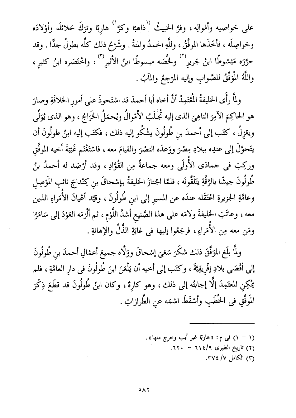 عَلَى حَوَاصِلِهِ وَأَمْوَالِهِ، وَفَرَّ الْخَبِيثُ ذَاهِبًا وَكَرَّ هَارِبًا وَتَرَكَ حَلَائِلَهُ وَأَوْلَادَهُ وَحَوَاصِلَهُ، فَأَخَذَهَا الْمُوَفَّقُ، وَلِلَّهِ الْحَمْدُ وَالْمِنَّةُ. وَشَرْحُ ذَلِكَ كُلِّهِ يَطُولُ جِدًّا. وَقَدْ حَرَّرَهُ مَبْسُوطًا ابْنُ جَرِيرٍ وَلَخَّصَهُ مَبْسُوطًا ابْنُ الْأَثِيرِ، وَاخْتَصَرَهُ ابْنُ كَثِيرٍ وَاللَّهُ الْمُوَفِّقُ لِلصَّوَابِ وَإِلَيْهِ الْمَرْجِعُ وَالْمَآبُ.