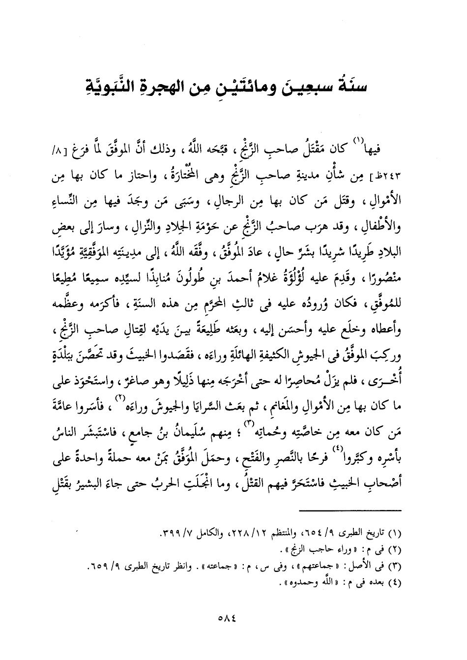 فِيهَا كَانَ مَقْتَلُ صَاحِبِ الزَّنْجِ قَبَّحَهُ اللَّهُ، وَذَلِكَ أَنَّ الْمُوَفَّقَ لَمَّا فَرَغَ مِنْ شَأْنِ مَدِينَةِ صَاحِبِ الزَّنْجِ وَهِيَ الْمُخْتَارَةُ وَاحْتَازَ مَا كَانَ بِهَا مِنَ الْأَمْوَالِ، وَقَتَلَ مَنْ كَانَ بِهَا مِنَ الرِّجَالِ، وَسَبَى مَنْ وَجَدَ فِيهَا مِنَ النِّسَاءِ وَالْأَطْفَالِ، وَقَدْ هَرَبَ صَاحِبُ الزَّنْجِ عَنْ حَوْمَةِ الْجِلَادِ وَالنِّزَالِ، وَسَارَ إِلَى بَعْضِ الْبِلَادِ طَرِيدًا شَرِيدًا بِشَرِّ حَالٍ، عَادَ الْمُوَفَّقُ - وَفَّقَهُ اللَّهُ - إِلَى مَدِينَتِهِ الْمُوَفَّقِيَّةِ مُؤَيَّدًا مَنْصُورًا، وَقَدِمَ عَلَيْهِ لُؤْلُؤَةُ غُلَامُ أَحْمَدَ بْنِ طُولُونَ مُنَابِذًا لِسَيِّدِهِ سَمِيعًا مُطِيعًا لِلْمُوَفَّقِ، فَكَانَ وُرُودُهُ عَلَيْهِ فِي ثَالِثِ الْمُحَرَّمِ مِنْ هَذِهِ السَّنَةِ، فَأَكْرَمَهُ وَعَظَّمَهُ وَأَعْطَاهُ وَخَلَعَ عَلَيْهِ وَأَحْسَنَ إِلَيْهِ، وَبَعَثَهُ طَلِيعَةً بَيْنَ يَدَيْهِ لِقِتَالِ صَاحِبِ الزَّنْجِ وَرَكِبَ الْمُوَفَّقُ فِي الْجُيُوشِ الْكَثِيفَةِ الْهَائِلَةِ وَرَاءَهُ، فَقَصَدُوا الْخَبِيثَ وَقَدْ تَحَصَّنَ بِبَلْدَةٍ أُخْرَى، فَلَمْ يَزَلْ مُحَاصِرًا لَهُ حَتَّى أَخْرَجَهُ مِنْهَا ذَلِيلًا وَهُوَ صَاغِرٌ، وَاسْتَحْوَذَ عَلَى مَا كَانَ بِهَا مِنَ الْأَمْوَالِ وَالْمَغَانِمِ، ثُمَّ بَعَثَ السَّرَايَا وَالْجُيُوشَ وَرَاءَهُ، فَأَسَرُوا عَامَّةَ مَنْ كَانَ مَعَهُ مِنْ خَاصَّتِهِ وَحُمَاتِهِ ; مِنْهُمْ سُلَيْمَانُ بْنُ جَامِعٍ، فَاسْتَبْشَرَ النَّاسُ بِأَسْرِهِ وَكَبَّرُوا فَرَحًا بِالنَّصْرِ وَالْفَتْحِ، وَحَمَلَ الْمُوَفَّقُ بِمَنِّ مَعَهُ حَمْلَةً وَاحِدَةً عَلَى أَصْحَابِ الْخَبِيثِ فَاسْتَحَرَّ فِيهِمُ الْقَتْلُ، وَمَا انْجَلَتِ الْحَرْبُ حَتَّى جَاءَ الْبَشِيرُ بِقَتْلِ