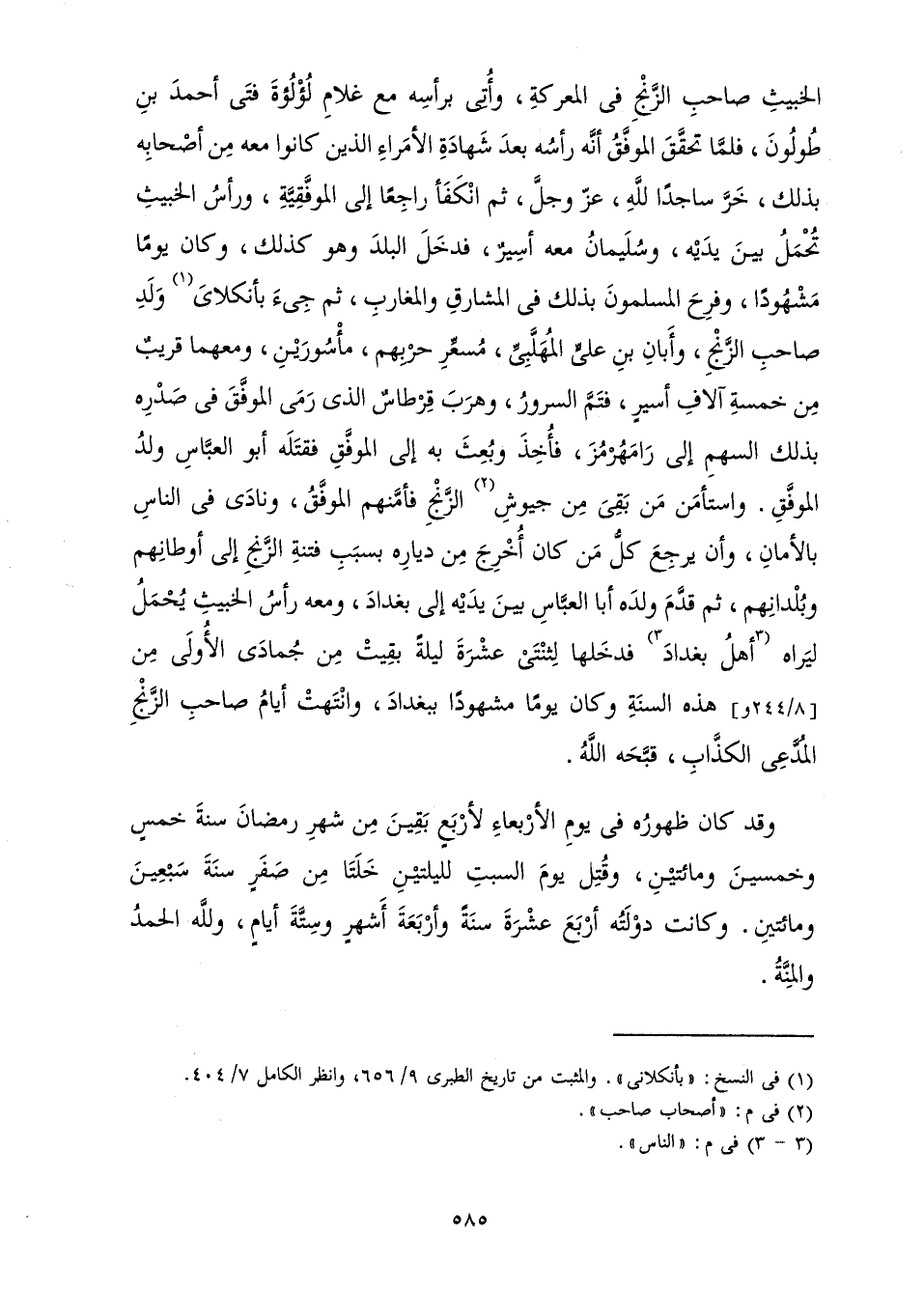 الْخَبِيثِ صَاحِبِ الزَّنْجِ فِي الْمَعْرَكَةِ، وَأَتَى بِرَأْسِهِ مَعَ غُلَامِ لُؤْلُؤَةَ فَتَى أَحْمَدَ بْنِ طُولُونَ فَلَمَّا تَحَقَّقَ الْمُوَفَّقُ أَنَّهُ رَأَسُهُ بَعْدَ شَهَادَةِ الْأُمَرَاءِ الَّذِينَ كَانُوا مَعَهُ مِنْ أَصْحَابِهِ بِذَلِكَ، خَرَّ سَاجِدًا لِلَّهِ - عَزَّ وَجَلَّ - ثُمَّ انْكَفَأَ رَاجِعًا إِلَى الْمُوَفَّقِيَّةِ، وَرَأْسُ الْخَبِيثِ تُحْمَلُ بَيْنَ يَدَيْهِ، وَسُلَيْمَانَ مَعَهُ أَسِيرٌ، فَدَخَلَ الْبَلَدَ وَهُوَ كَذَلِكَ، وَكَانَ يَوْمًا مَشْهُودًا، وَفَرِحَ الْمُسْلِمُونَ بِذَلِكَ فِي الْمَشَارِقِ وَالْمَغَارِبِ، ثُمَّ جِيءَ بِأَنْكَلَايَ وَلَدِ صَاحِبِ الزَّنْجِ وَأَبَانِ بْنِ عَلِيٍّ الْمُهَلَّبِيِّ، مُسَعَّرِ حَرْبِهِمْ، مَأْسُورَيْنِ، وَمَعَهُمَا قَرِيبٌ مِنْ خَمْسَةِ آلَافِ أَسِيرٍ، فَتَمَّ السُّرُورُ، وَهَرَبَ قِرْطَاسٌ الَّذِي رَمَى الْمُوَفَّقَ فِي صَدْرِهِ بِذَلِكَ السَّهْمِ إِلَى رَامَهُرْمُزَ فَأُخِذَ وَبُعِثَ بِهِ إِلَى الْمُوَفَّقِ فَقَتَلَهُ أَبُو الْعَبَّاسِ وَلَدُ الْمُوَفَّقِ. وَاسْتَأْمَنَ مَنْ بَقِيَ مِنْ جُيُوشِ الزَّنْجِ فَأَمَّنَهُمُ الْمُوَفَّقُ، وَنَادَى فِي النَّاسِ بِالْأَمَانِ، وَأَنْ يَرْجِعَ كُلُّ مَنْ كَانَ أُخْرِجَ مِنْ دِيَارِهِ بِسَبَبِ فِتْنَةِ الزَّنْجِ إِلَى أَوْطَانِهِمْ وَبُلْدَانِهِمْ، ثُمَّ قَدَّمَ وَلَدَهُ أَبَا الْعَبَّاسِ بَيْنَ يَدَيْهِ إِلَى بَغْدَادَ وَمَعَهُ رَأْسُ الْخَبِيثِ يُحْمَلُ لِيَرَاهُ أَهْلُ بَغْدَادَ فَدَخَلَهَا لِثِنْتَيْ عَشْرَةَ لَيْلَةً بَقِيتْ مِنْ جُمَادَى الْأُولَى مِنْ هَذِهِ السَّنَةِ وَكَانَ يَوْمًا مَشْهُودًا بِبَغْدَادَ، وَانْتَهَتْ أَيَّامُ صَاحِبِ الزَّنْجِ الْمُدَّعِي الْكَذَّابِ، قَبَّحَهُ اللَّهُ.