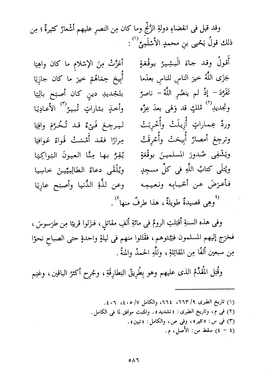 وَقَدْ قِيلَ فِي انْقِضَاءِ دَوْلَةِ الزَّنْجِ وَمَا كَانَ مِنَ النَّصْرِ عَلَيْهِمْ أَشْعَارٌ كَثِيرَةٌ ; مِنْ ذَلِكَ قَوْلُ يَحْيَى بْنِ مُحَمَّدٍ الْأَسْلَمِيِّ: