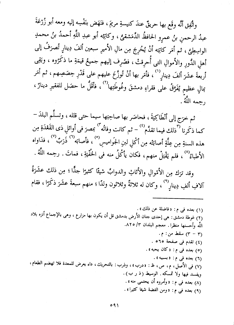 وَاتَّفَقَ أَنَّهُ وَقَعَ بِهَا حَرِيقٌ عِنْدَ كَنِيسَةِ مَرْيَمَ، فَنَهَضَ بِنَفْسِهِ إِلَيْهِ وَمَعَهُ أَبُو زُرْعَةَ عَبْدُ الرَّحْمَنِ بْنُ عَمْرٍو الْحَافِظُ الدِّمَشْقِيُّ، وَكَاتِبُهُ أَبُو عَبْدِ اللَّهِ أَحْمَدُ بْنُ مُحَمَّدٍ الْوَاسِطِيُّ، ثُمَّ أَمَرَ كَاتِبَهُ أَنْ يُخْرِجَ مِنْ مَالِ الْأَمِيرِ سَبْعِينَ أَلْفَ دِينَارٍ تُصْرَفُ إِلَى أَهْلِ الدُّورِ وَالْأَمْوَالِ الَّتِي أُحْرِقَتْ، فَصَرَفَ إِلَيْهِمْ جَمِيعَ قِيمَةِ مَا ذَكَرُوهُ، وَبَقِيَ أَرْبَعَةَ عَشَرَ أَلْفَ دِينَارٍ، فَأَمَرَ بِهَا أَنْ تُوَزَّعَ عَلَيْهِمْ عَلَى قَدْرِ حِصَصِهِمْ، ثُمَّ أَمَرَ بِمَالٍ عَظِيمٍ يُفَرَّقُ عَلَى فُقَرَاءِ دِمَشْقَ وَغُوطَتِهَا، فَأَقَلُّ مَا حَصَلَ لِلْفَقِيرِ دِينَارٌ، رَحِمَهُ اللَّهُ.