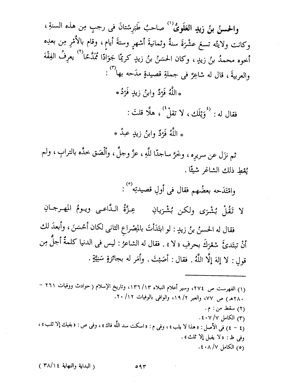فَقَالَ لَهُ الْحَسَنُ بْنُ زَيْدٍ: لَوِ ابْتَدَأَتْ بِالْمِصْرَاعِ الثَّانِي لَكَانَ أَحْسَنَ، وَأَبْعَدَ لَكَ أَنْ تَبْتَدِئَ شِعْرَكَ بِحَرْفِ " لَا ". فَقَالَ لَهُ الشَّاعِرُ: لَيْسَ فِي الدُّنْيَا كَلِمَةٌ أَجْلَّ مَنْ قَوْلِ: لَا إِلَهَ إِلَّا اللَّهُ. فَقَالَ: أَصَبْتَ. وَأَمَرَ لَهُ بِجَائِزَةٍ سَنِيَّةٍ.
