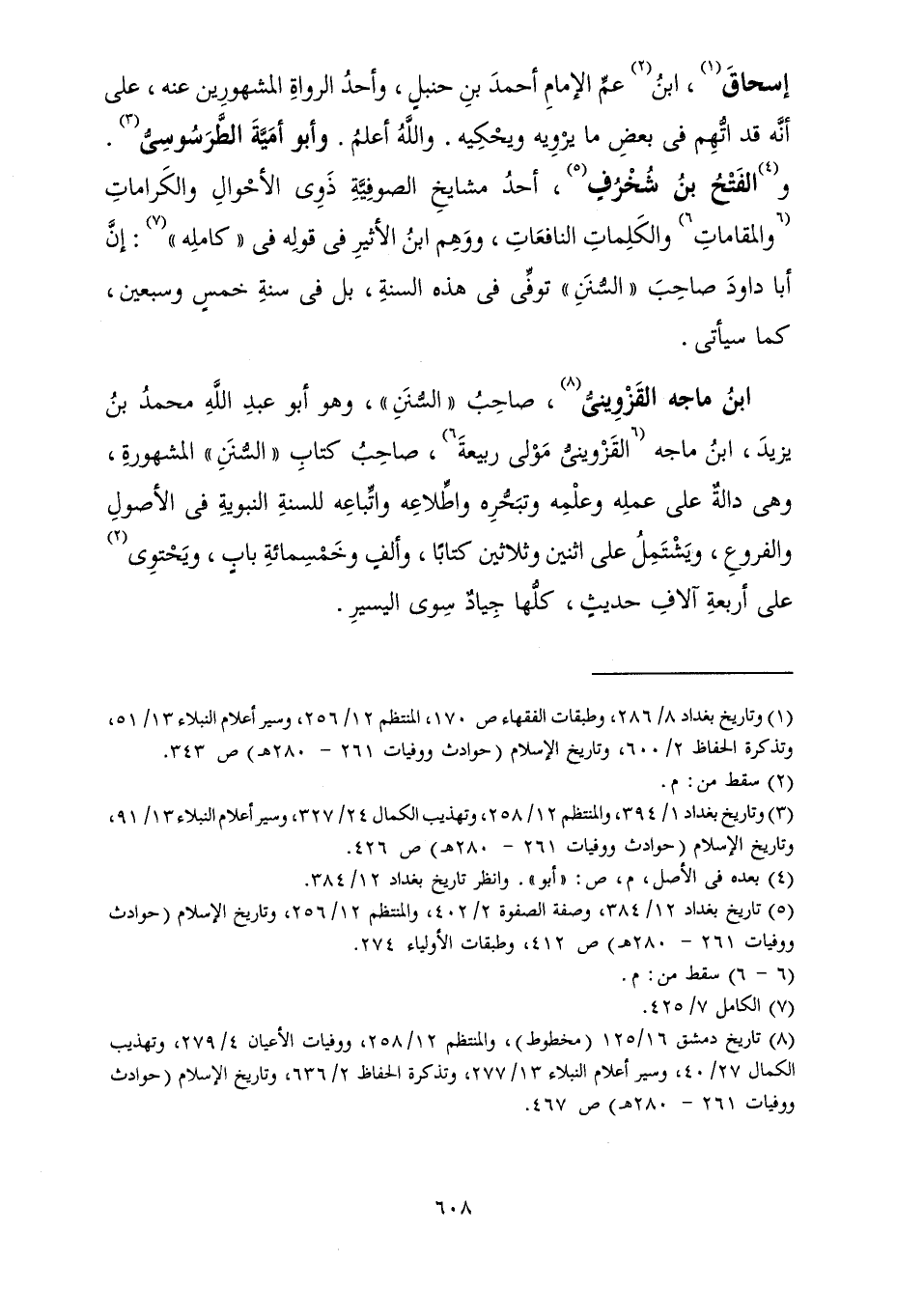 صَاحِبُ " السُّنَنِ "، وَهُوَ أَبُو عَبْدِ اللَّهِ مُحَمَّدُ بْنُ يَزِيدَ، ابْنُ مَاجَهْ الْقَزْوِينِيُّ مَوْلَى رَبِيعَةَ، صَاحِبُ كِتَابِ " السُّنَنِ " الْمَشْهُورَةِ، وَهِيَ دَالَّةٌ عَلَى عَمَلِهِ وَعِلْمِهِ وَتَبَحُّرِهِ وَاطِّلَاعِهِ وَاتِّبَاعِهِ لِلسُّنَّةِ النَّبَوِيَّةِ فِي الْأُصُولِ وَالْفُرُوعِ، وَيَشْتَمِلُ عَلَى اثْنَيْنِ وَثَلَاثِينَ كِتَابًا، وَأَلْفٍ وَخَمْسِمِائَةِ بَابٍ، وَيَحْتَوِي عَلَى أَرْبَعَةِ آلَافِ حَدِيثٍ، كُلُّهَا جِيَادٌ سِوَى الْيَسِيرِ.