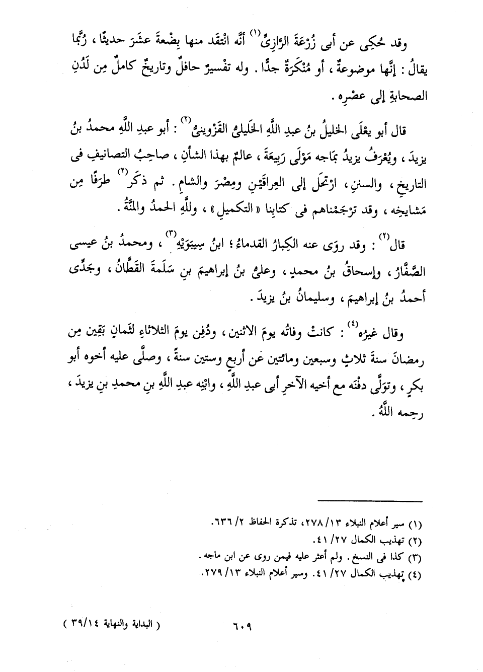 قَالَ أَبُو يَعْلَى الْخَلِيلُ بْنُ عَبْدِ اللَّهِ الْخَلِيلِيُّ الْقَزْوِينِيُّ: أَبُو عَبْدِ اللَّهِ مُحَمَّدُ بْنُ يَزِيدَ وَيَعْرِفُ يَزِيدُ بِمَاجَهْ مَوْلَى رَبِيعَةَ، عَالِمٌ بِهَذَا الشَّأْنِ، صَاحِبُ التَّصَانِيفِ فِي التَّارِيخِ، وَالسُّنَنِ، ارْتَحَلَ إِلَى الْعِرَاقَيْنِ وَمِصْرَ وَالشَّامِ. ثُمَّ ذَكَرَ طَرَفًا مِنْ مَشَايِخِهِ، وَقَدْ تَرْجَمْنَاهُمْ فِي كِتَابِنَا " التَّكْمِيلِ " وَلِلَّهِ الْحَمْدُ وَالْمِنَّةُ.