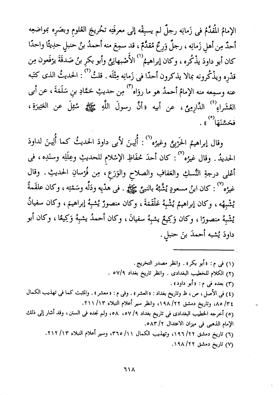 الْإِمَامُ الْمُقَدَّمُ فِي زَمَانِهِ رَجُلٌ لَمْ يَسْبِقْهُ إِلَى مَعْرِفَتِهِ تَخْرِيجَ الْعُلُومِ وَبَصَرِهِ بِمَوَاضِعِهِ أَحَدٌ مِنْ أَهْلِ زَمَانِهِ، رَجُلٌ وَرِعٌ مُقَدَّمٌ، قَدْ سَمِعَ مِنْهُ أَحْمَدُ بْنُ حَنْبَلٍ حَدِيثًا وَاحِدًا كَانَ أَبُو دَاوُدَ يَذْكُرُهُ، وَكَانَ إِبْرَاهِيمُ الْأَصْبَهَانِيُّ وَأَبُو بَكْرِ بْنُ صَدَقَةَ يَرْفَعُونَ مِنْ قَدْرِهِ وَيَذْكُرُونَهُ بِمَا لَا يَذْكُرُونَ أَحَدًا فِي زَمَانِهِ مِثْلَهُ. قُلْتُ: الْحَدِيثُ الَّذِي كَتَبَهُ عَنْهُ وَسَمِعَهُ مِنْهُ الْإِمَامُ أَحْمَدُ هُوَ مَا رَوَاهُ مِنْ حَدِيثِ حَمَّادِ بْنِ سَلَمَةَ عَنْ أَبِي الْعُشَرَاءِ الدَّارِمِيِّ عَنْ أَبِيهِ " أَنَّ رَسُولَ اللَّهِ صَلَّى اللَّهُ عَلَيْهِ وَسَلَّمَ سُئِلَ عَنِ الْعَتِيرَةِ، فَحَسَّنَهَا ".
